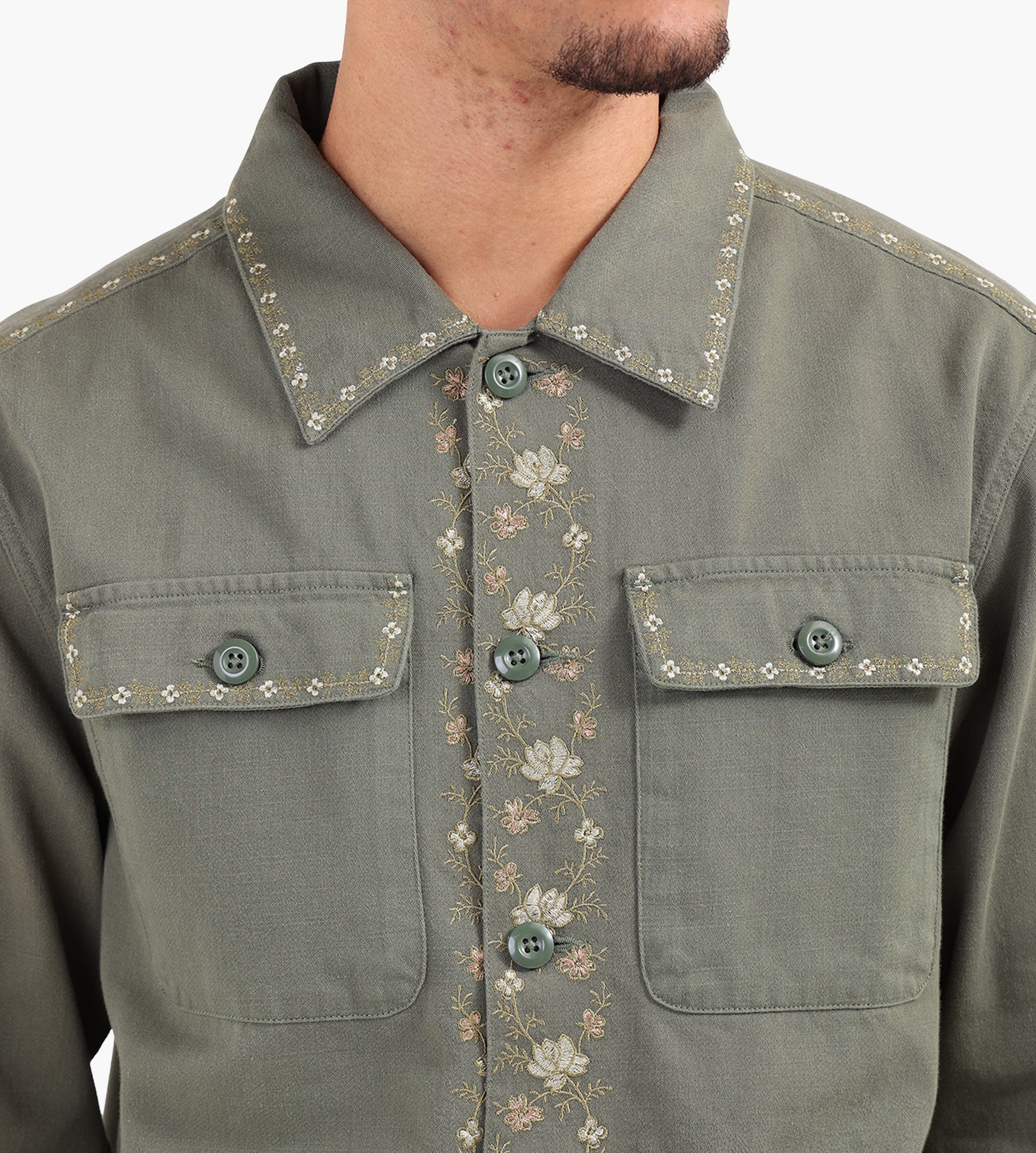 The Corridor Embroidered Military Jacket in Olive is built from 100% cotton and finished in soft, spring-weight corduroy. The fabric’s subtle texture is complemented by contrast stitching, adding depth to its utilitarian roots. Functional details, including a single flap chest pocket and side-entry hip pockets, enhance its practicality for everyday use.
