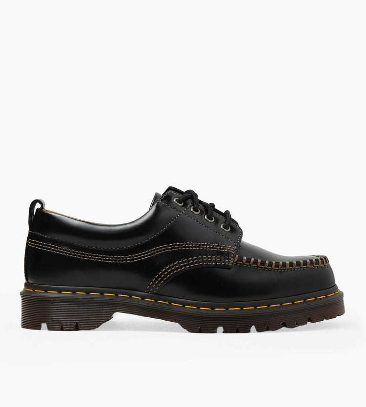 The Dr. Martens Lowell in Black Analine is a contemporary take on the classic moc-toe shoe. Crafted from durable black Analine leather, it features a padded collar for comfort and is built on a rugged BEN outsole with a yellow welt stitch, embodying the brand's signature durability and style.
