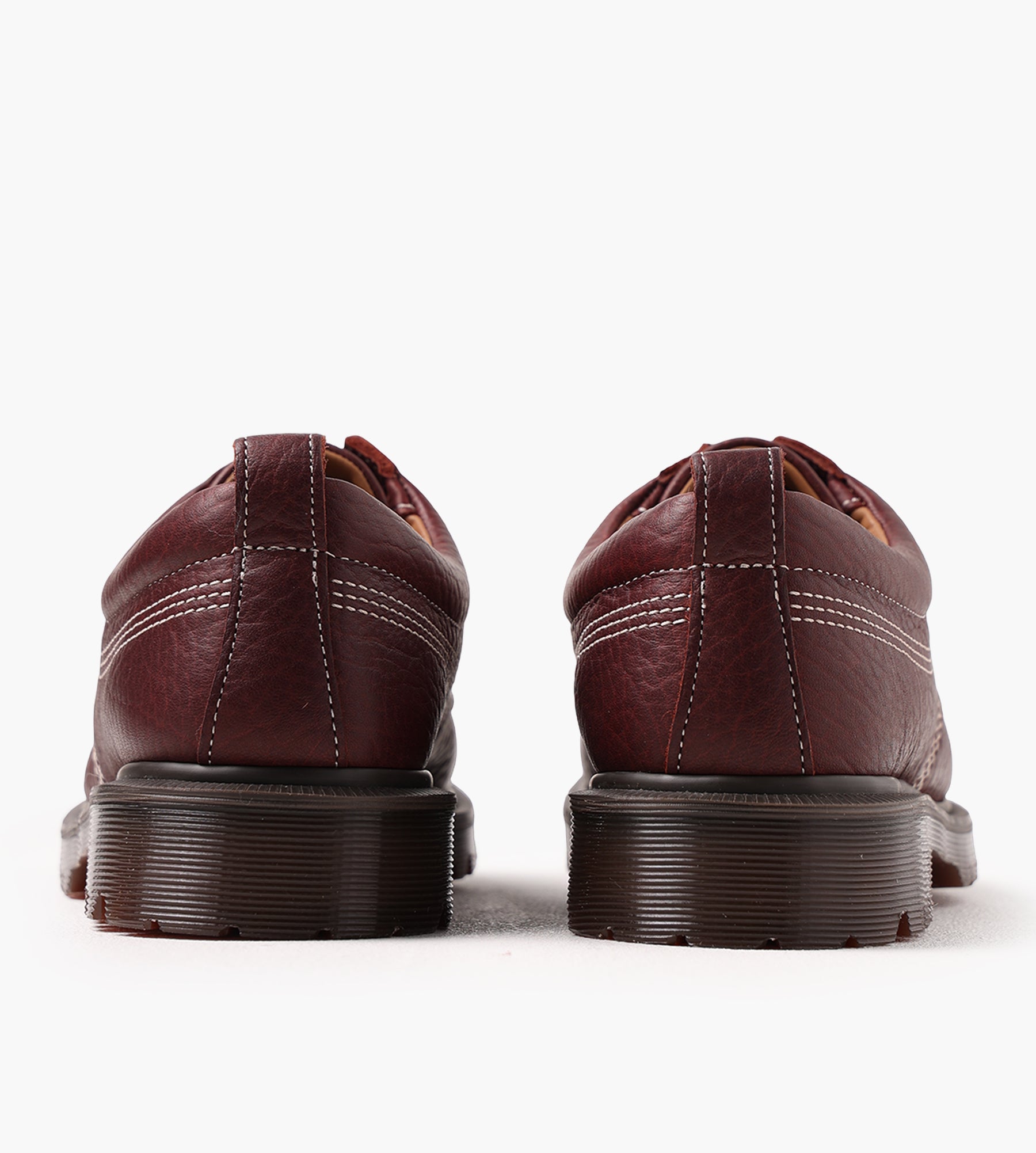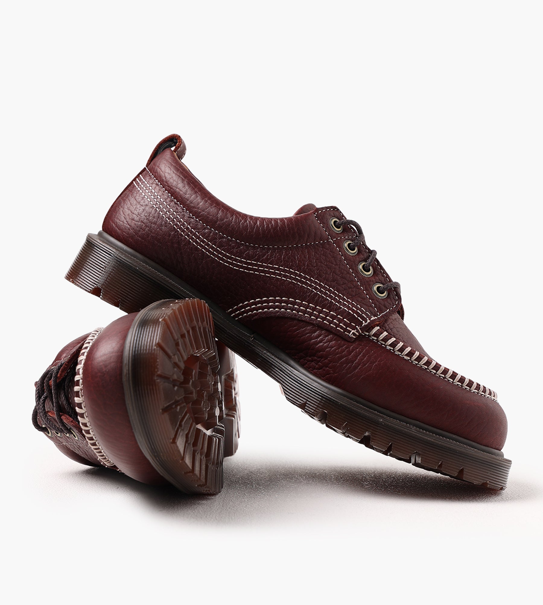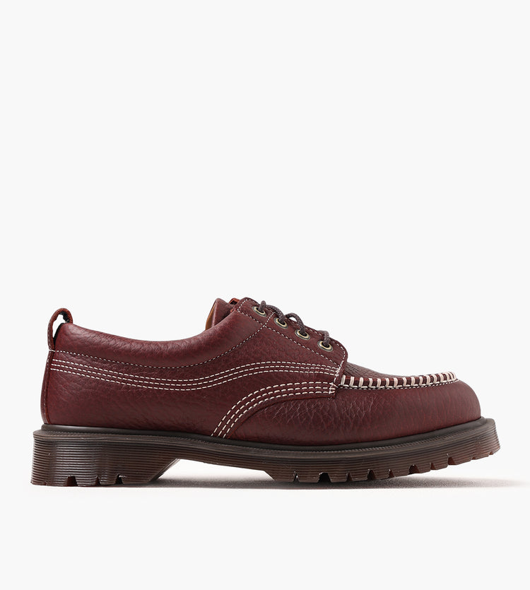 Dr. Martens Lowell Moc Toe Shoes in Russet Red are crafted from Wild Grain leather, featuring a heavily tumbled texture on soft oiled leather that enhances its natural character. The moc toe design is highlighted by ecru stitch detailing, while a padded ankle collar ensures all-day comfort.