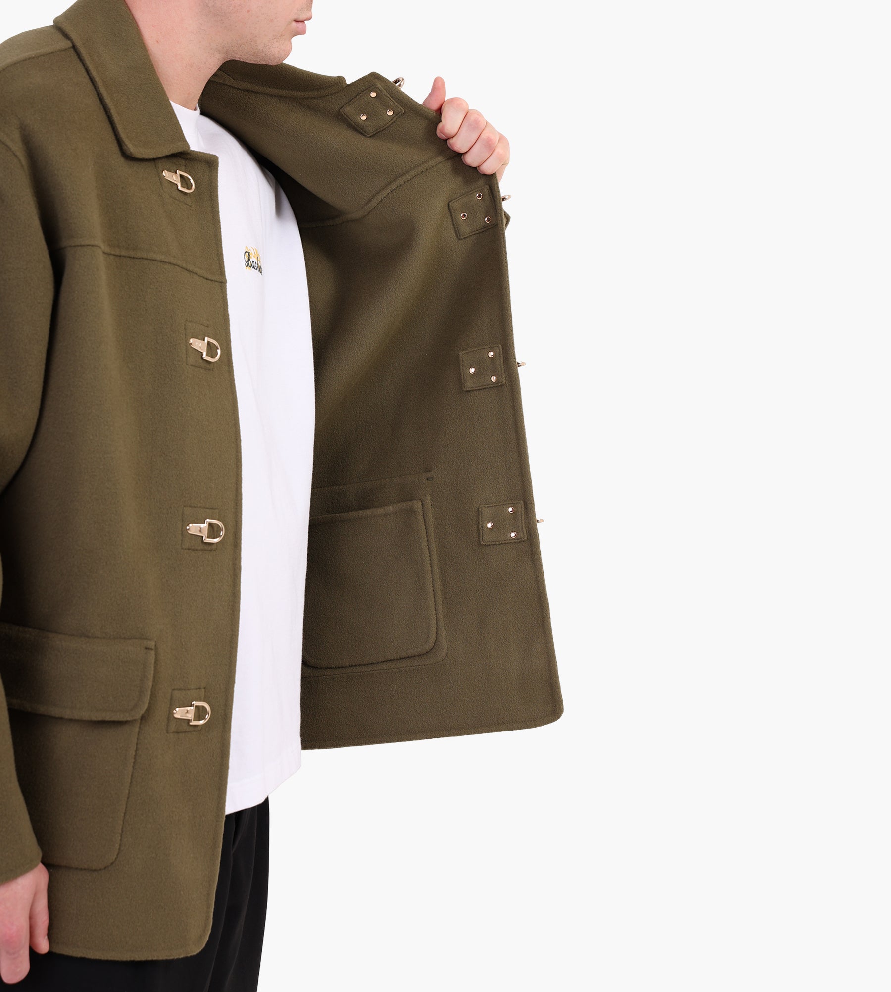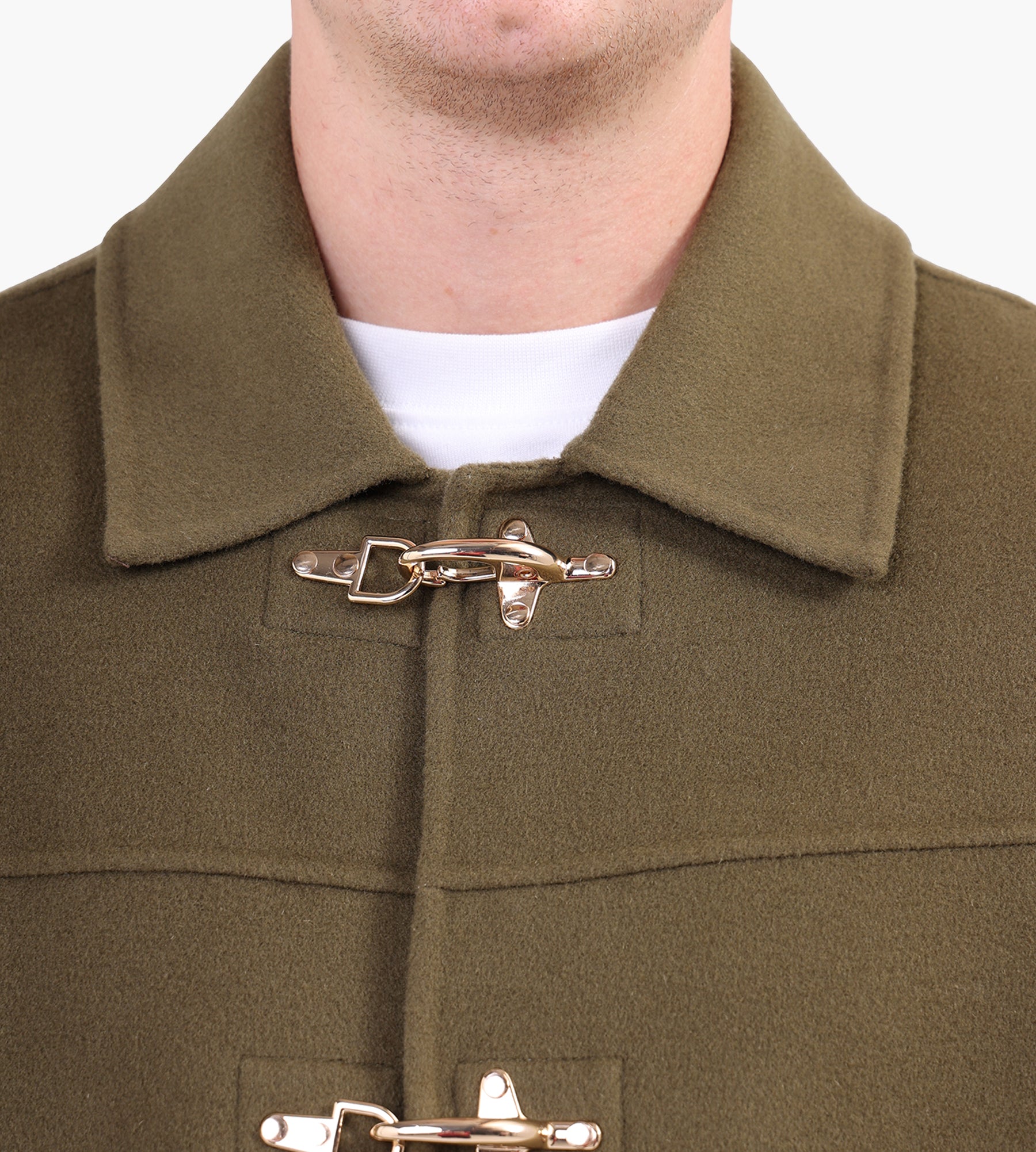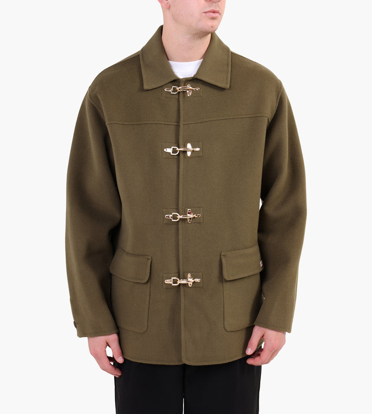 The Drôle de Monsieur La Veste Caban Jacket in Khaki is crafted from an 80% wool and 20% nylon blend, offering a balance of warmth and durability. This double-faced peacoat features a refined shirt collar and four golden firefighter-style clasps, adding a modern twist to a timeless silhouette.