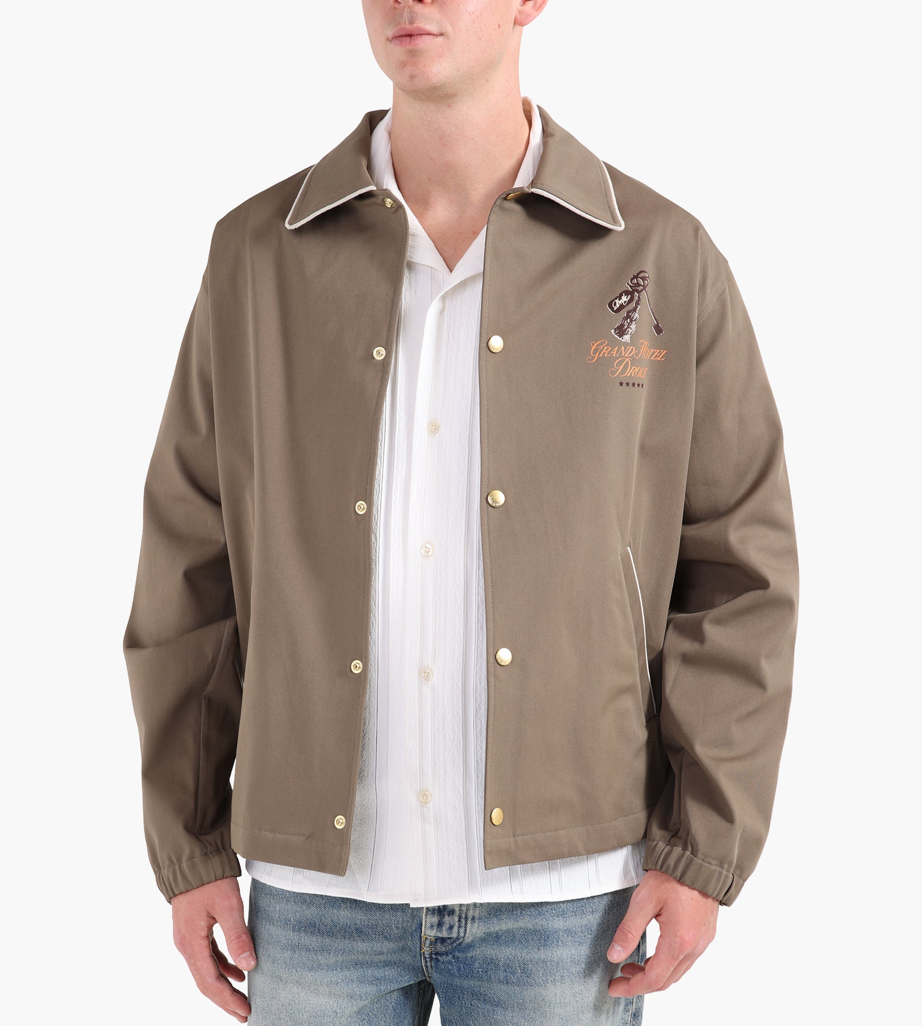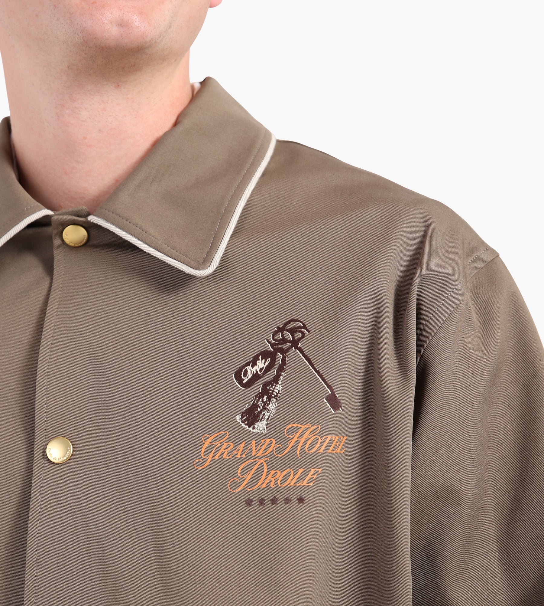 The Drôle de Monsieur La Veste Grand Hôtel in Taupe redefines the mens shacket with a balance of casual elegance and utility. Its tailored silhouette and neutral tone make it a versatile layer for both urban and travel settings, effortlessly bridging the gap between shirt and jacket.