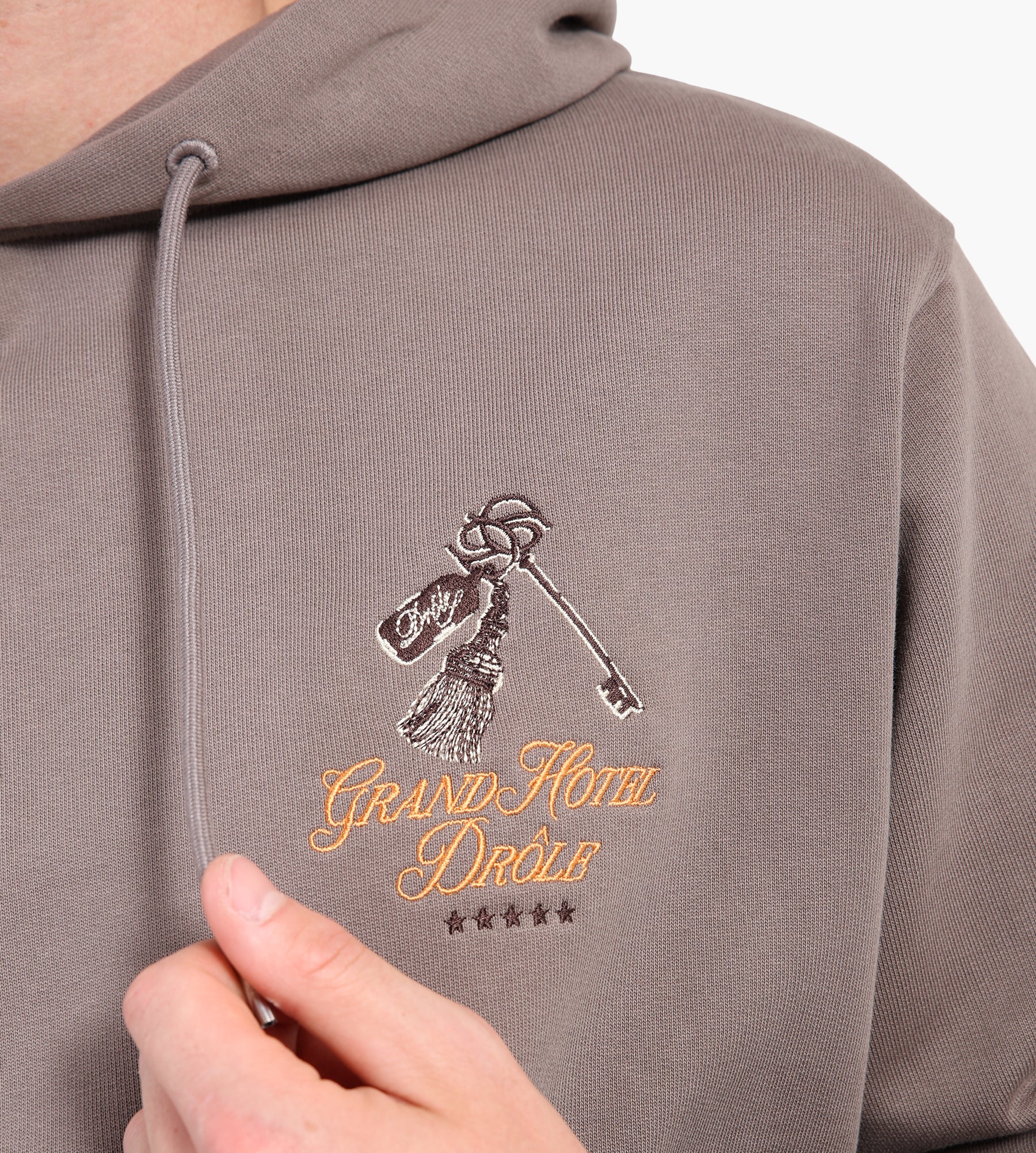 Drôle de Monsieur’s Grand Hotel Hoodie in Taupe is crafted from 100% cotton, using a 430gsm French terry jersey for a substantial yet breathable feel. The relaxed fit and '70s-inspired design are elevated by bold embroidered branding, while waxed drawstrings and ribbed finishes refine the silhouette.