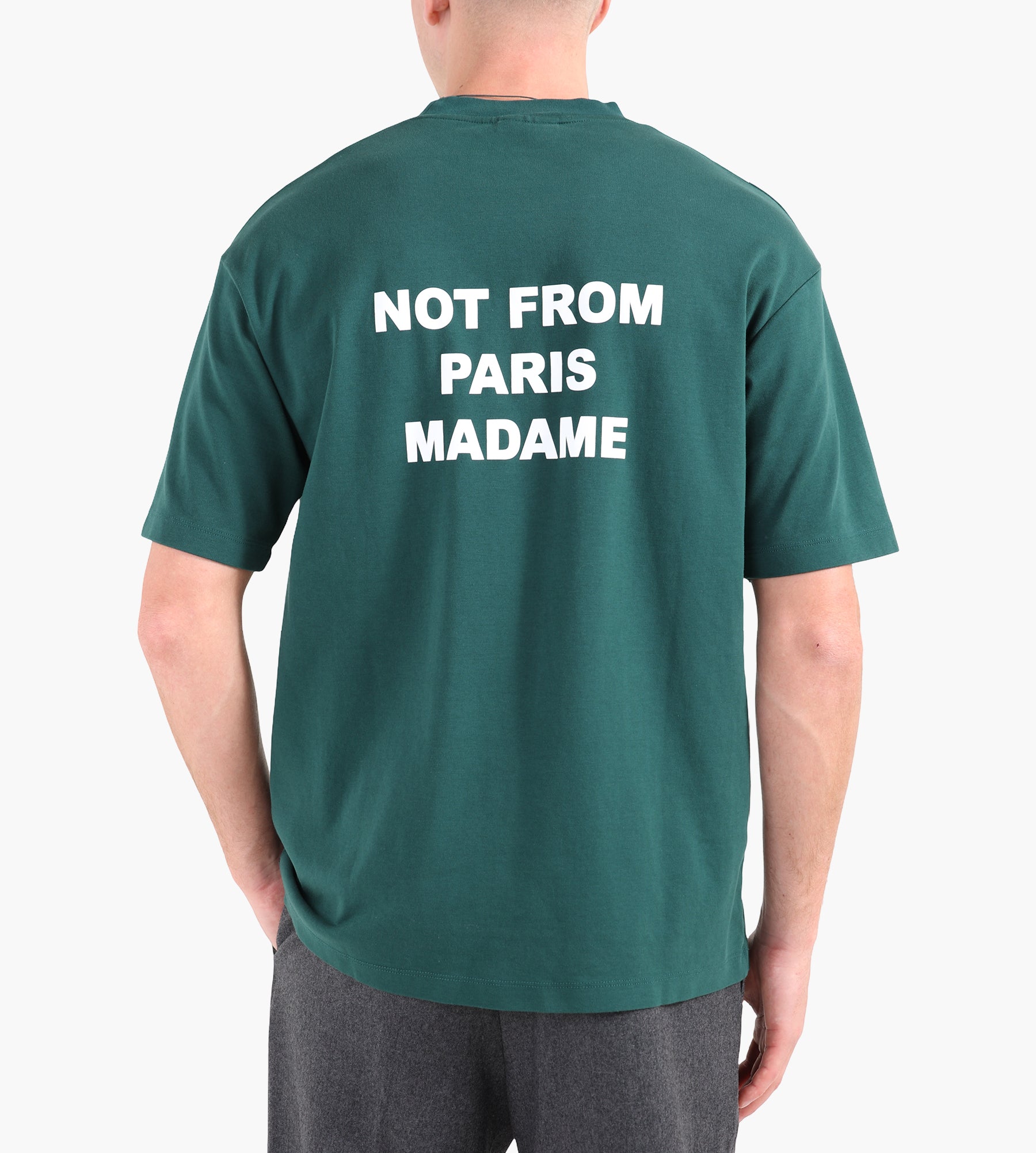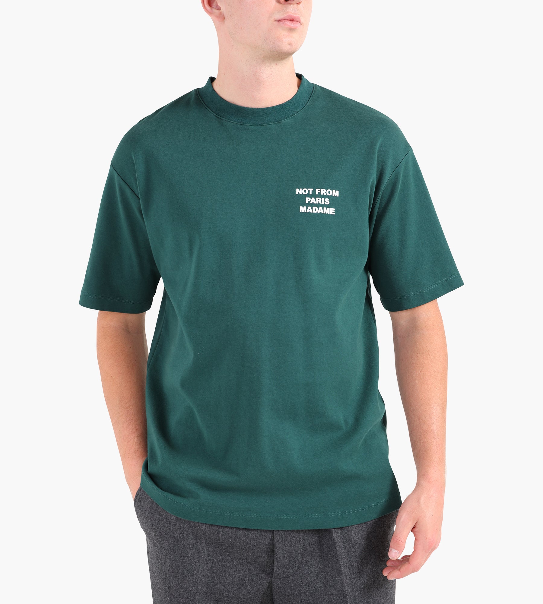 Drôle de Monsieur's Le T-Shirt Slogan in Dark Green combines soft cotton jersey with a relaxed drape, offering effortless wearability. The rich green hue is accentuated by a bold slogan print across the chest, adding a refined statement to its minimalist silhouette.