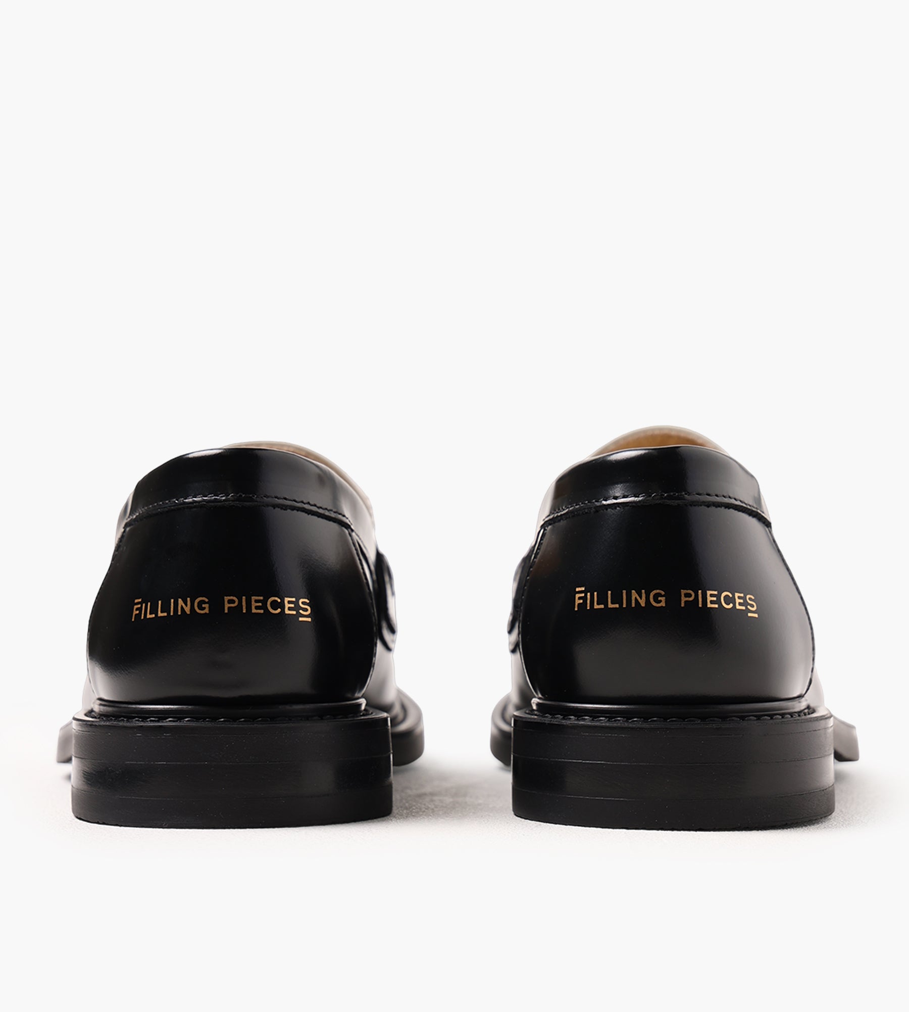 The Filling Pieces Loafer Speaker Wall in Black reimagines the loafer silhouette with high-shine polido leather for a sleek, polished finish. Drawing inspiration from the vibrant energy of '80s block parties, this design merges streetwear roots with refined craftsmanship. A chenille and embroidery 'Speaker Wall' patch anchors the look, adding a bold, tactile focal point that celebrates urban culture.