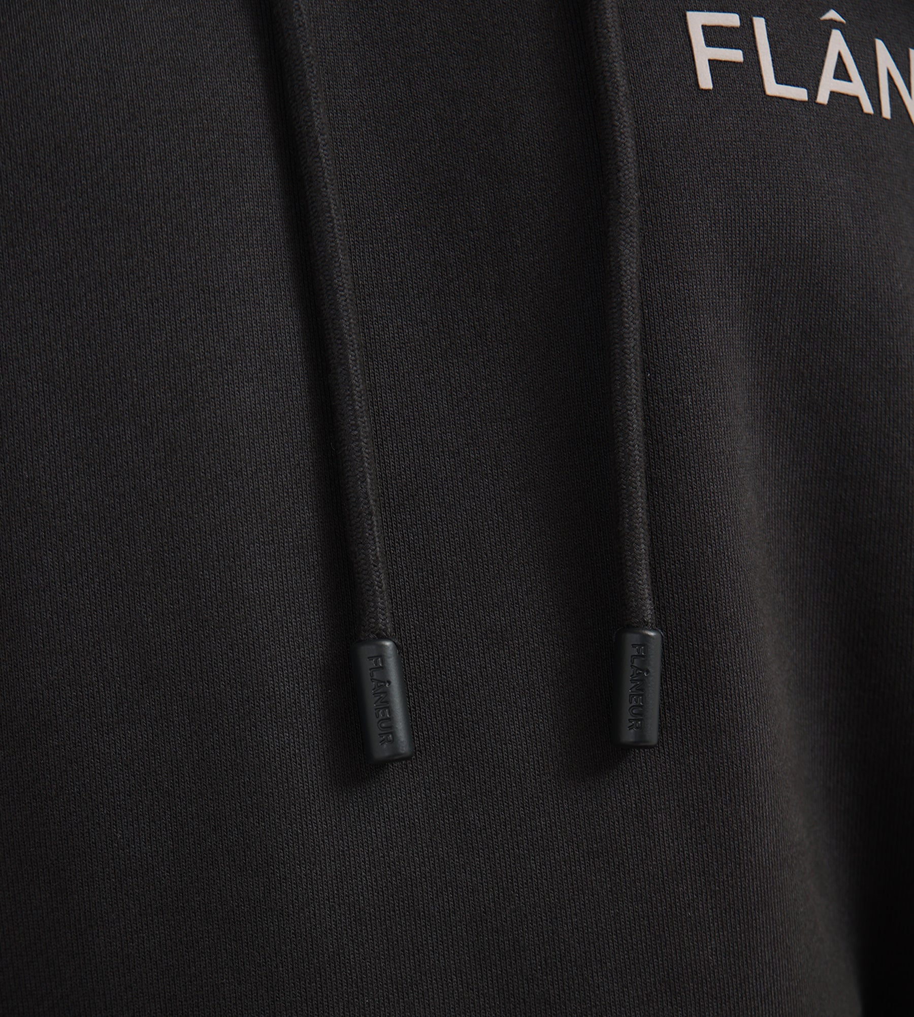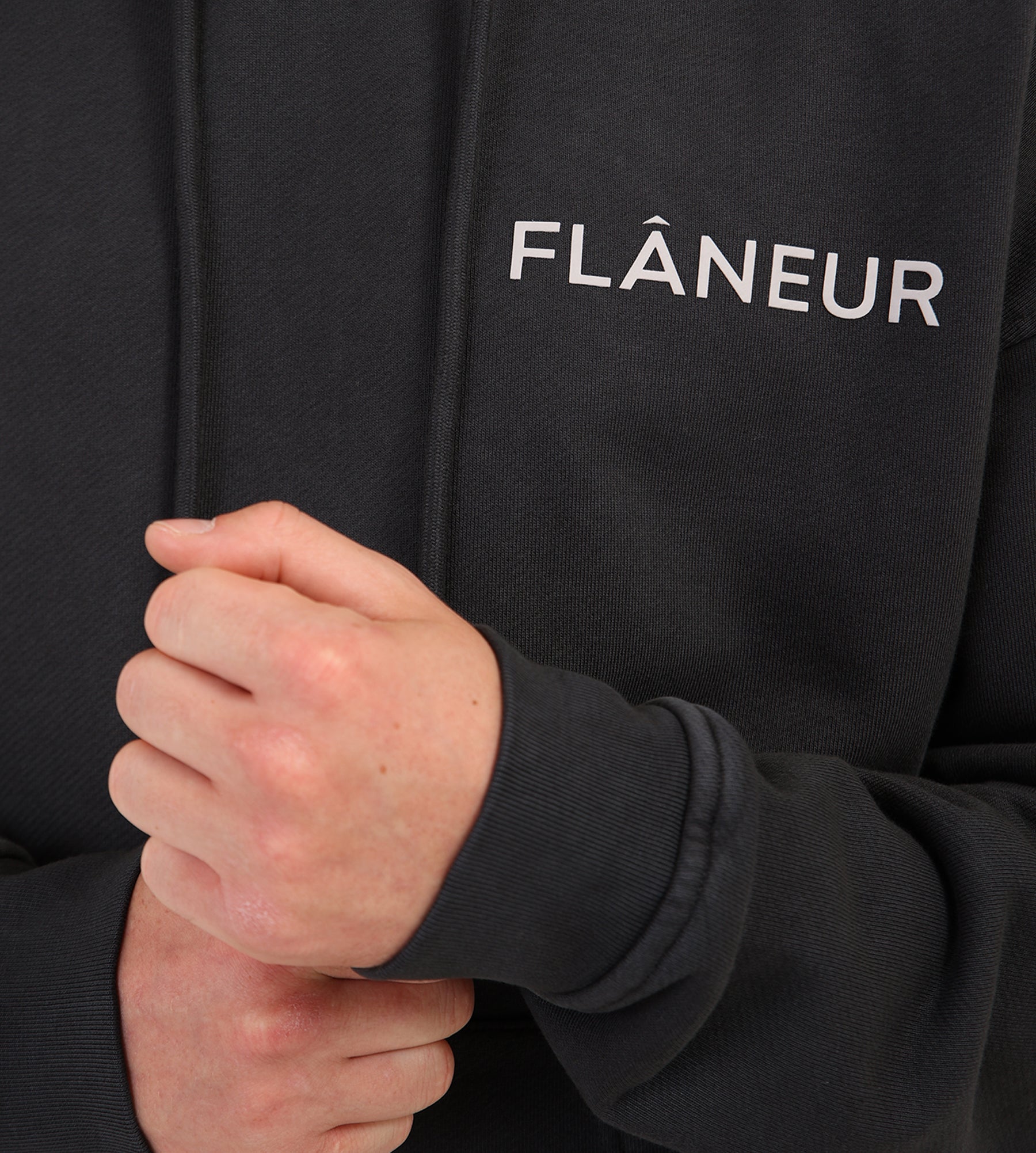 The Flâneur Double Logo Washed Hoodie in blue is crafted from a soft cotton blend, delivering a lived-in feel with a relaxed silhouette. A subtle washed finish enhances the fabric's depth, while the double logo detail anchors the piece in understated graphic appeal.