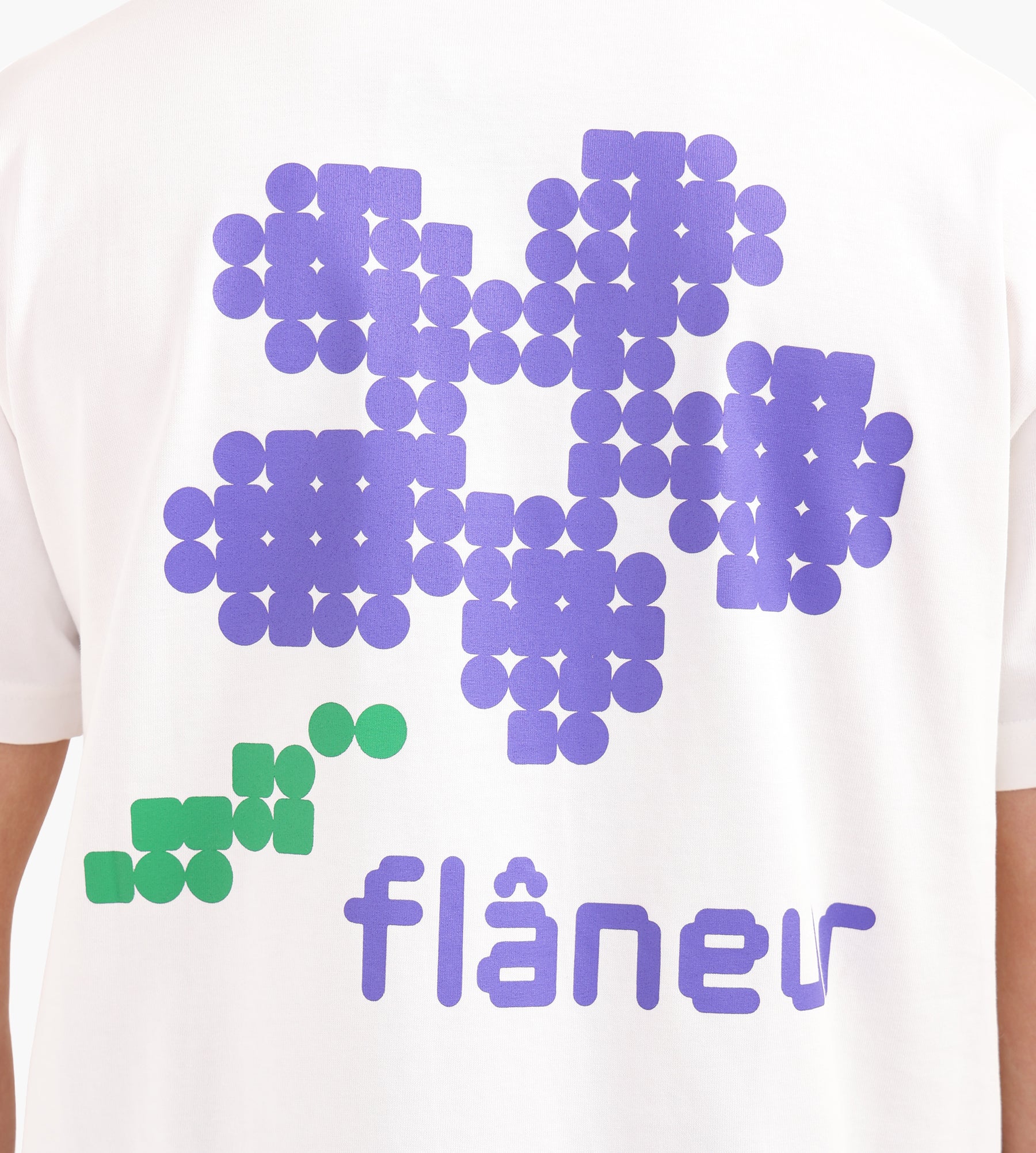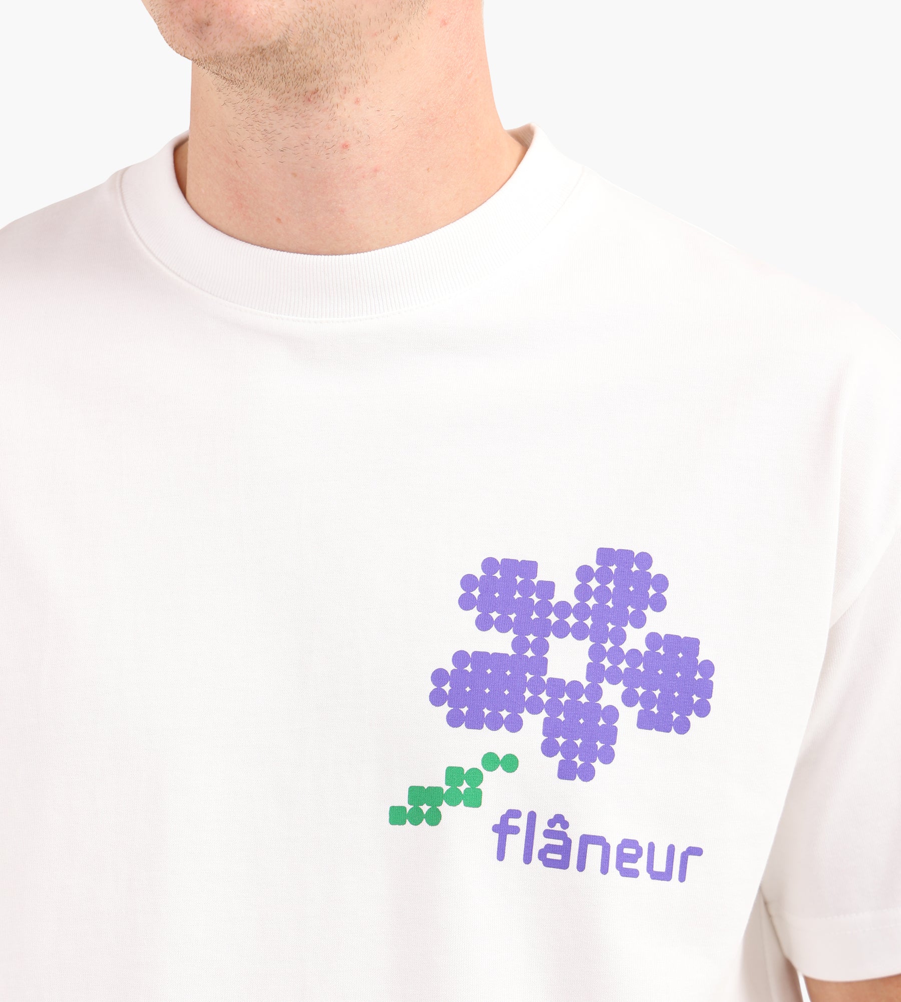The Flâneur Pixel Flower T-shirt in White is crafted from 100% cotton, offering a breathable and soft foundation for everyday wear. Its clean white base serves as the perfect canvas for the pixelated flower design, which graces both the front and back for a dynamic visual statement.