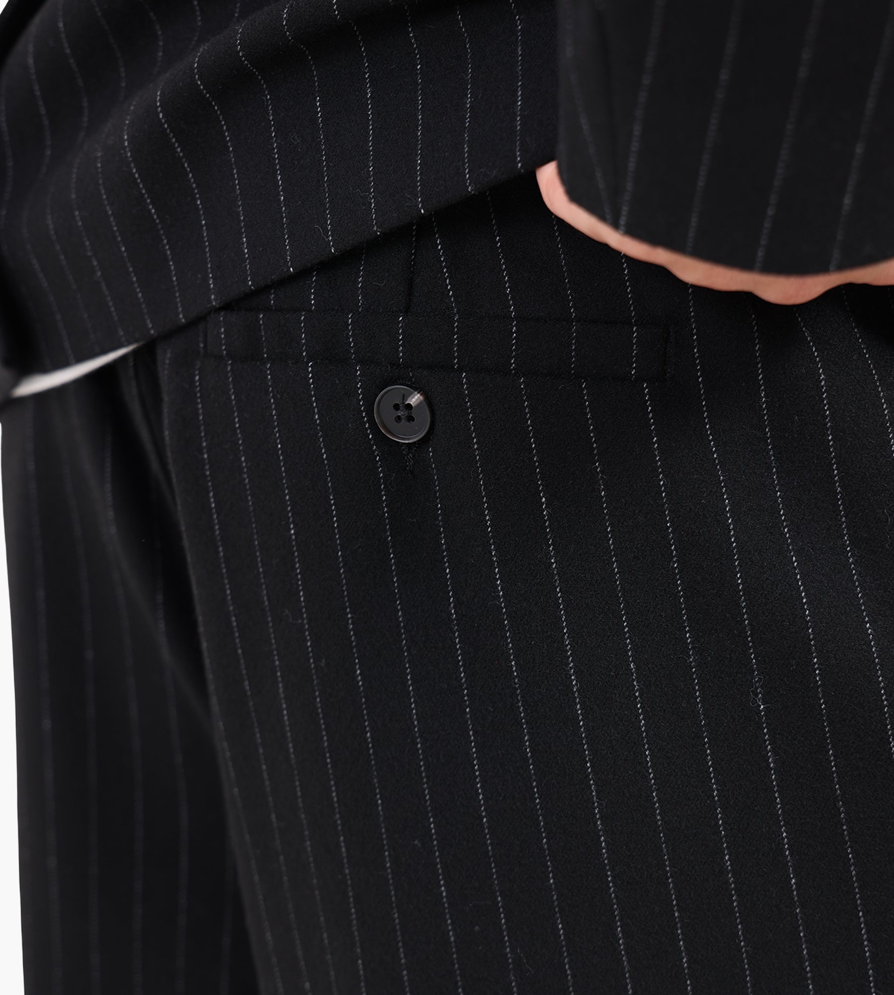 The Libertine-Libertine Agency Trousers in Black Pin are crafted from a refined blend of polyester, viscose, wool, and elastane, offering a balance of structure and comfort. The subtle pinstripe pattern enhances the classic wide-leg silhouette, while the elasticated waist and zip fly with button closure ensure ease of wear and a secure fit.