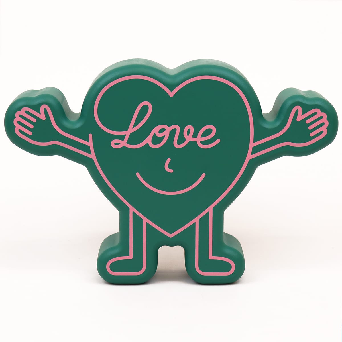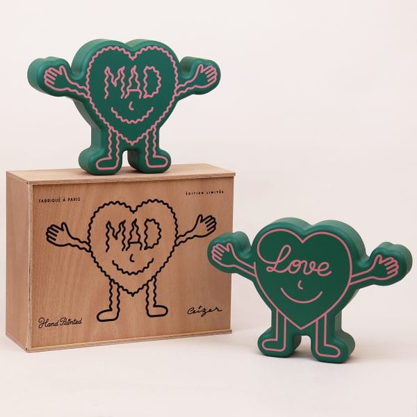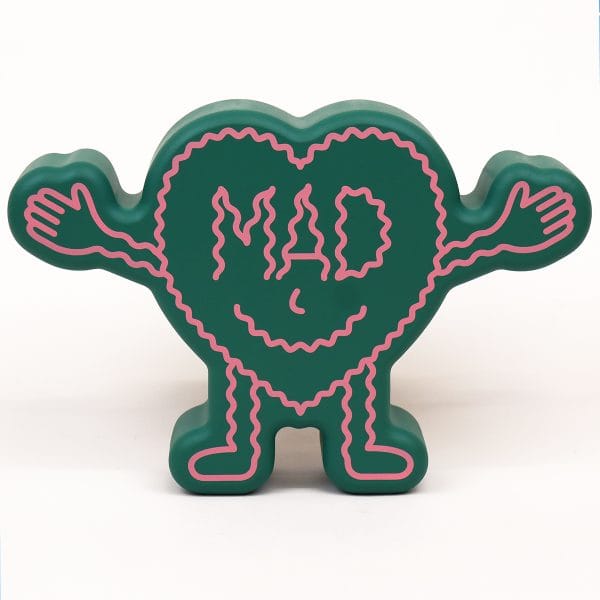 The front reads 'Mad', back reads 'Love'. Leaf Green sculpture with