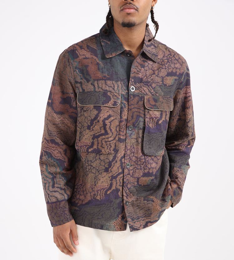 Gusseted pockets with narrow piping offer both utility and refinement, while metal buttons and silk-thread embroidery add subtle texture. Lapped panel seams with coverstitch detailing ensure durability, even as the fabric's digital print softens over time. Perfect for layering, this overshirt transitions effortlessly between casual and creative settings.
