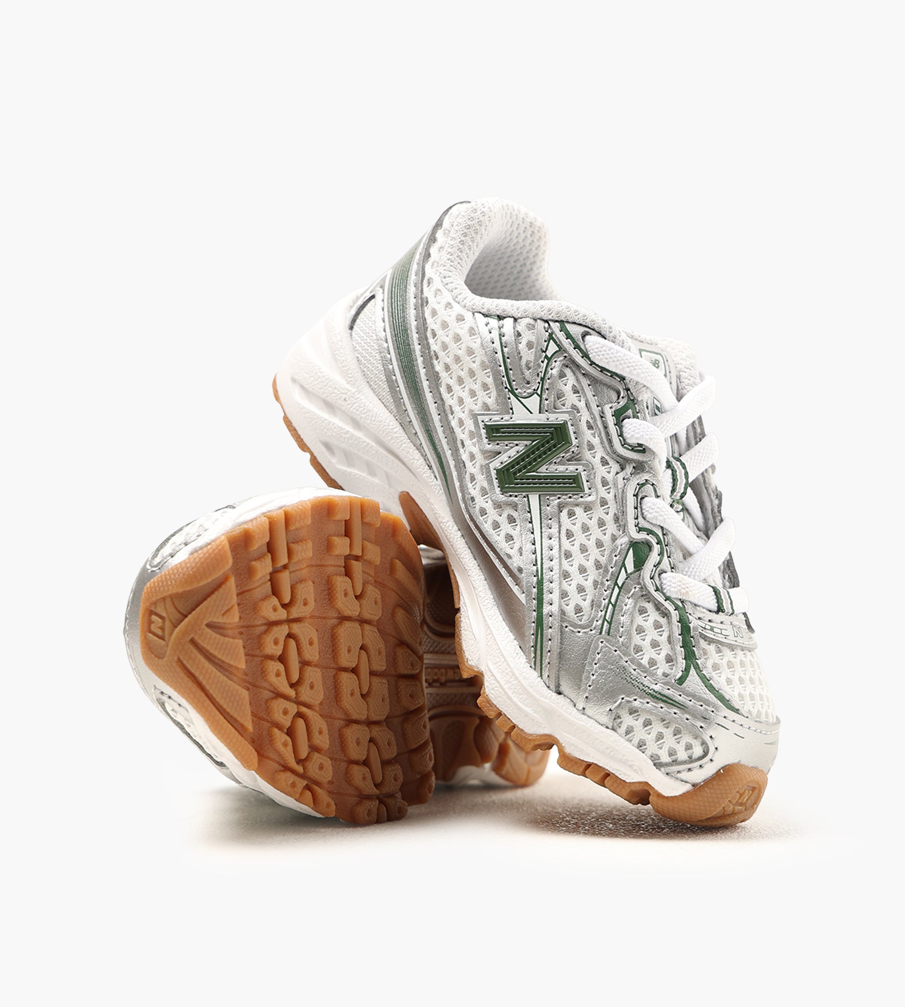 The New Balance 740 Bungee Lace sneakers in Silver Metallic/Dark Alpine Green combine a synthetic and mesh upper for lightweight durability. Drawing from Y2K retro running aesthetics, the molded TPU 'N' logo and reflective accents add a modern edge while enhancing visibility in low light.