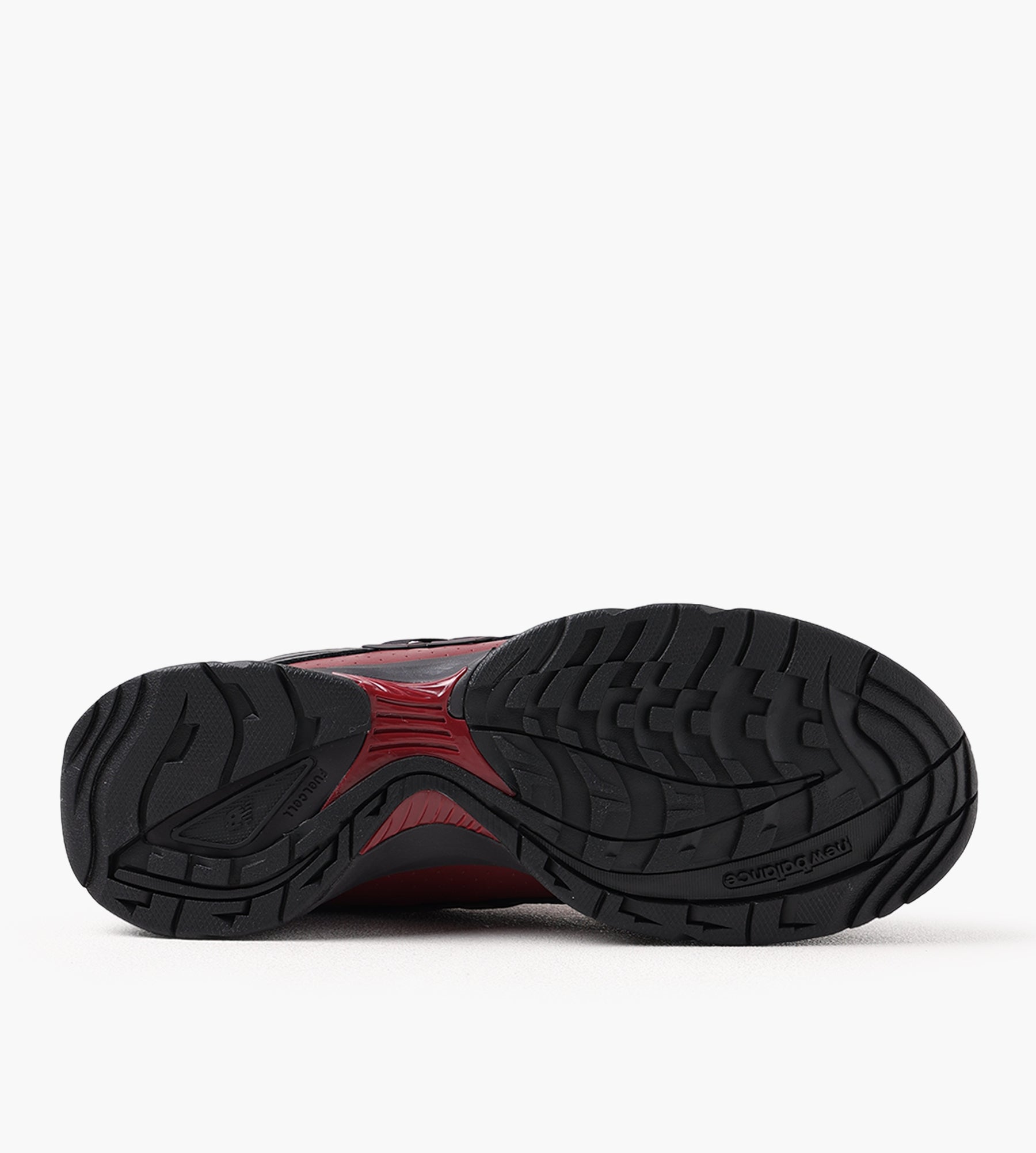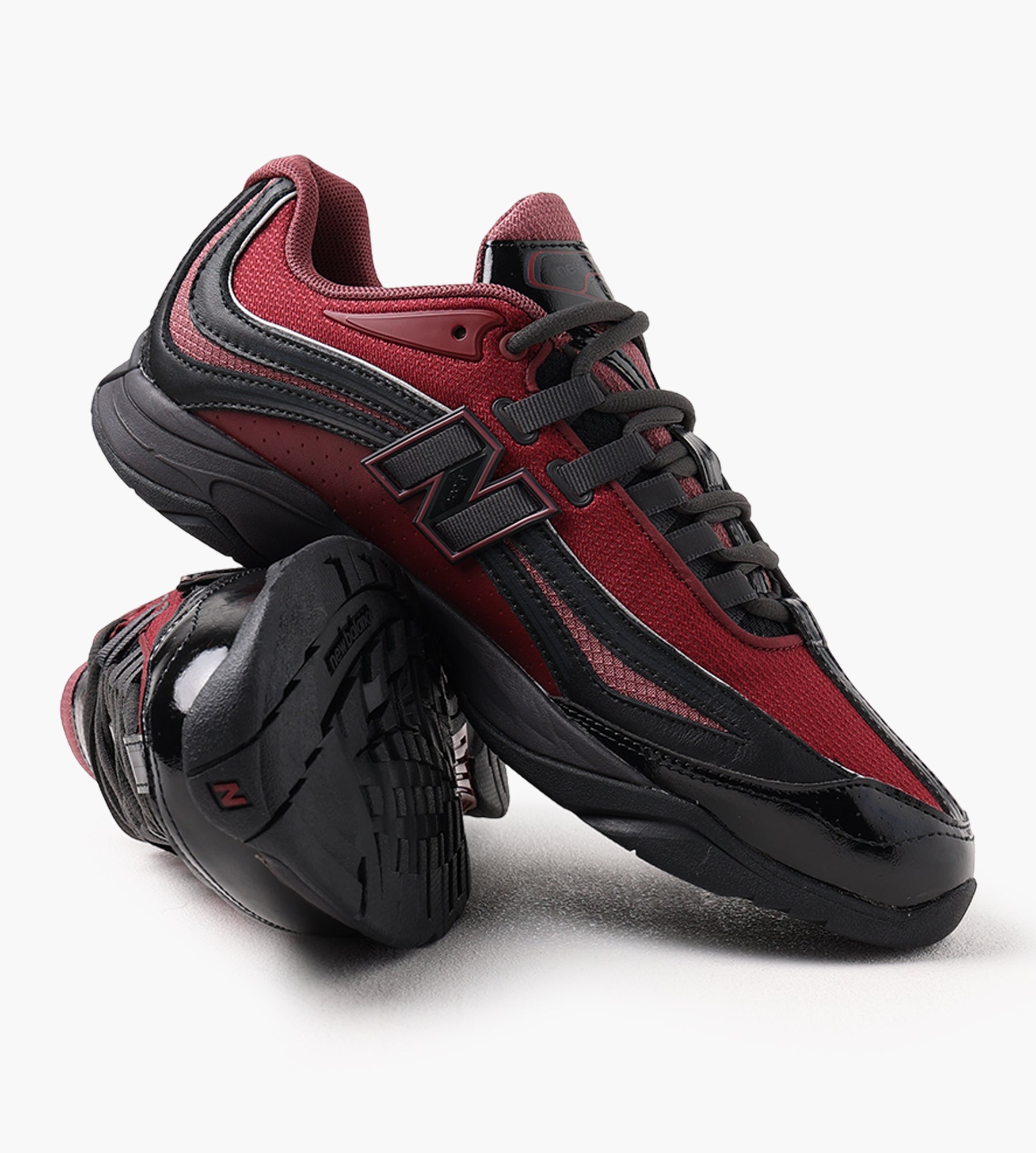 The New Balance RC56 Sneaker in Monarch Burgundy/Black draws inspiration from early 2000s cross-country racing shoes, blending archival design with modern performance. Its upper combines perforated leather and nylon mesh for breathability, accented by patent leather overlays that add a sleek, reflective dimension. Angular overlays and printed lines evoke speed and movement, grounding the aesthetic in dynamic energy.