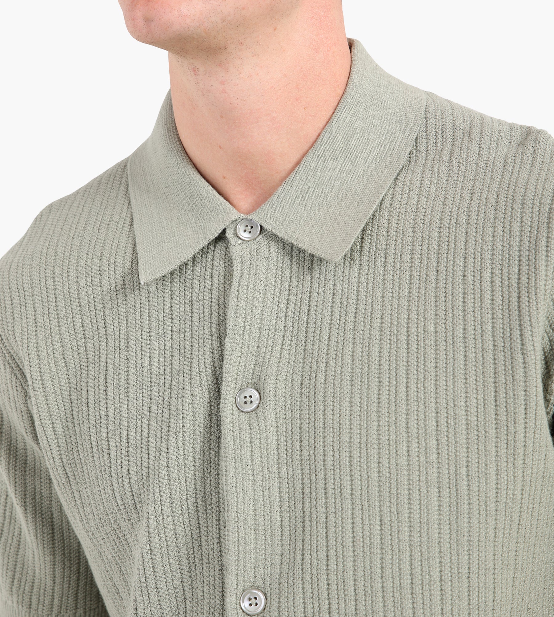 The NN.07 Nolan Polo Cardigan 6695 in Sage Green features a refined ribbed structure crafted from organic cotton. This open-collar polo cardigan blends classic details with modern style, making it a versatile piece for any wardrobe.