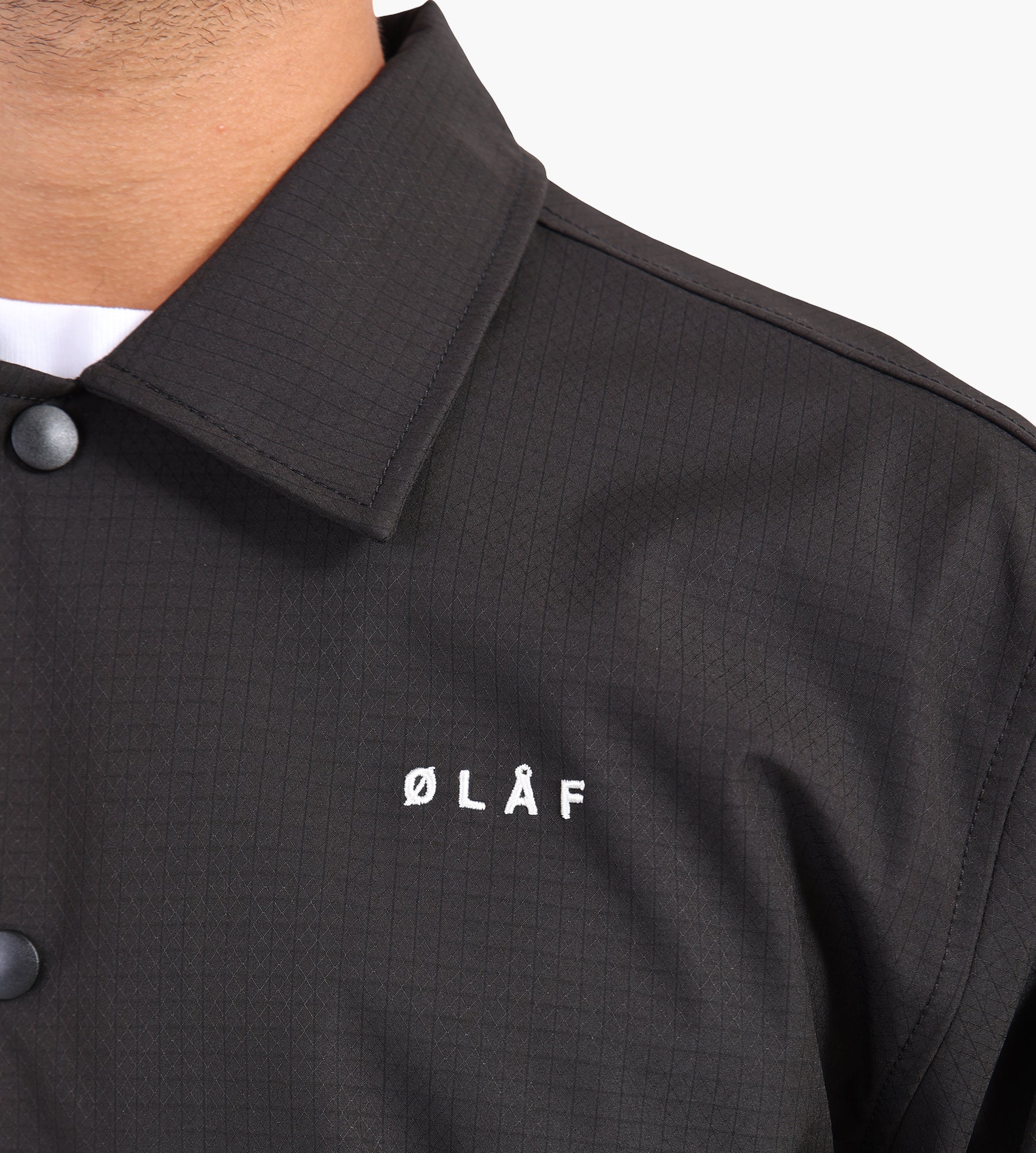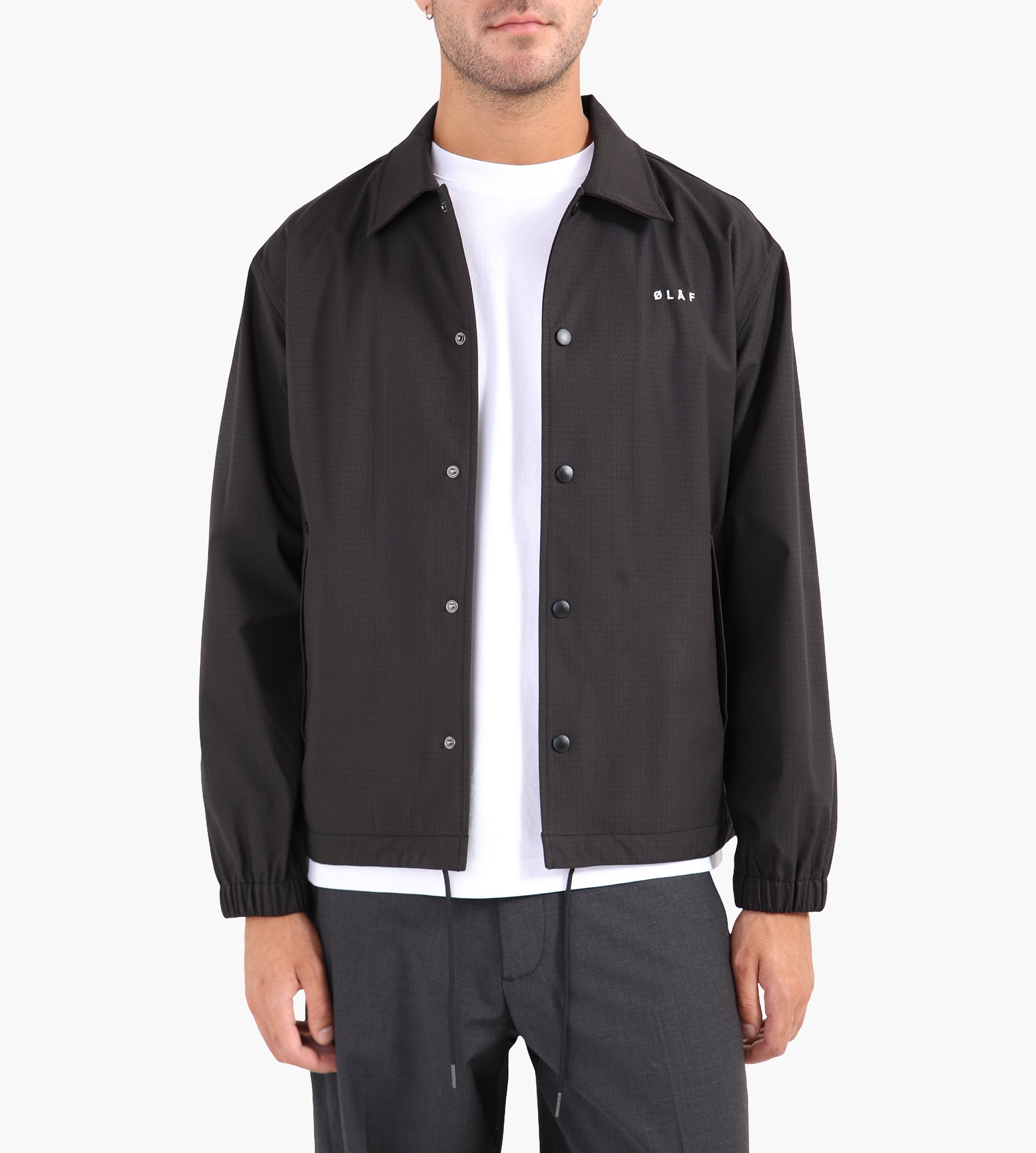 The OLAF Modern Maker Coach Jacket in Black offers a refined take on a classic silhouette. Featuring a clean, pared-back design, its standout detail is the Wall Sculpture design, adding subtle artistry to its minimalist profile.