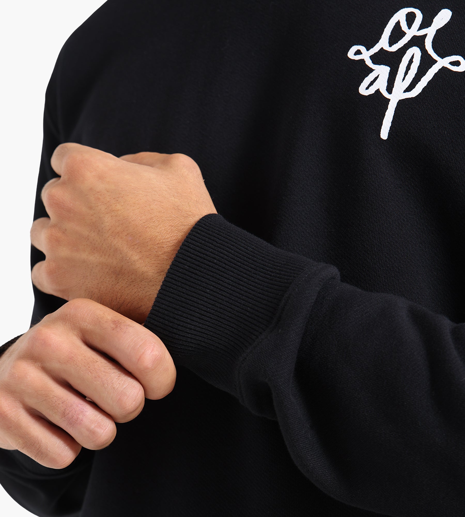 The OLAF Monogram Graphic Crewneck in Black balances minimalist design with subtle detailing. Its monogram graphic anchors the piece, offering a refined visual identity against the deep black backdrop. The classic crewneck silhouette ensures a timeless profile, making it a versatile addition to any wardrobe.