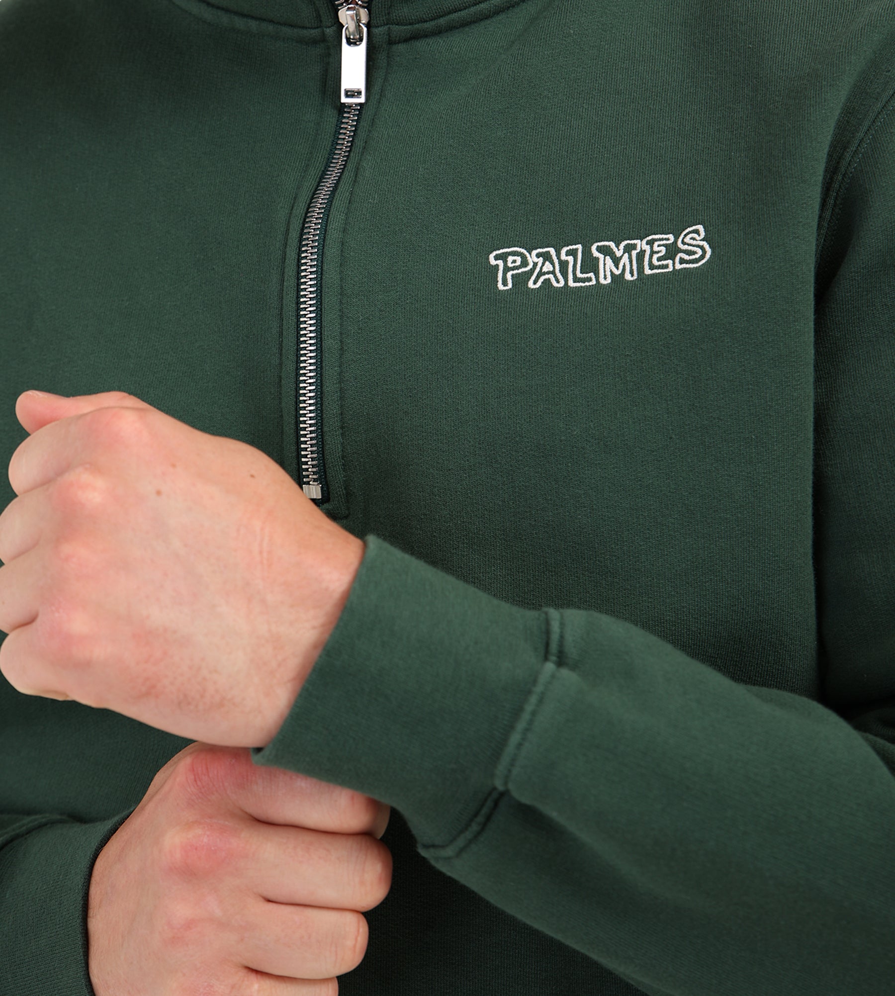 The Palmes Remember Zip Sweatshirt in Dark Green is crafted from 100% cotton, offering a breathable and durable layer with a pre-washed finish for a vintage-soft hand feel. Its half-zip design and high neckline anchor the piece with functional versatility, while a YKK zipper ensures smooth operation and longevity.