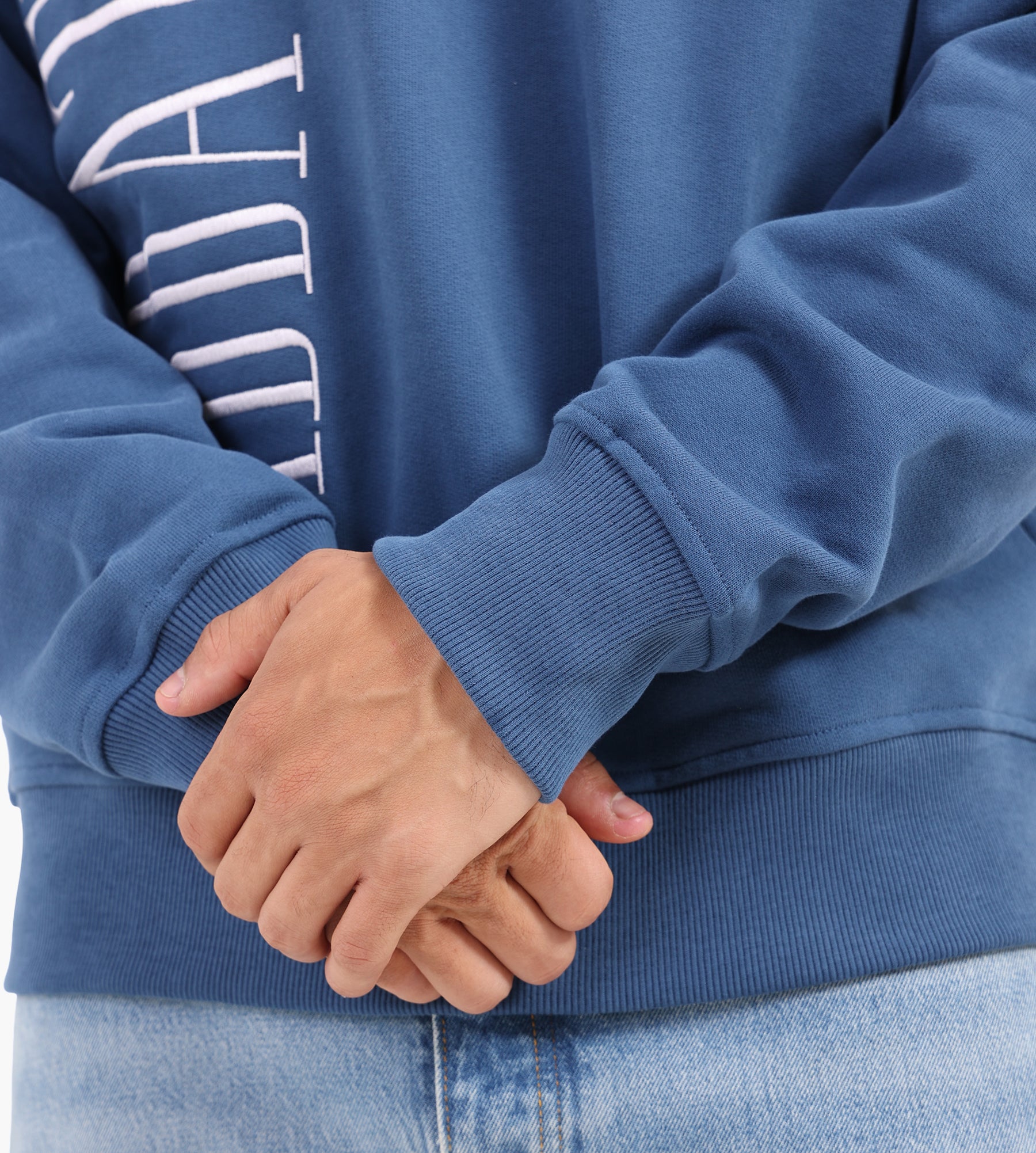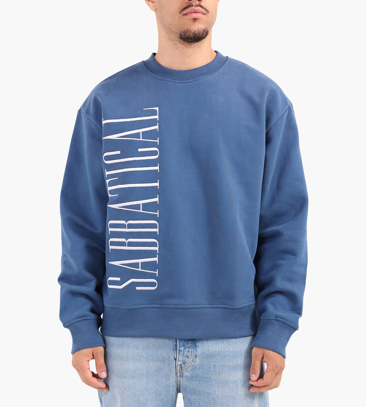 The Sabbatical Logo Crewneck in Night Blue/White combines timeless design with thoughtful craftsmanship. Made from a soft cotton-blend fabric, it offers a breathable yet cozy layer for everyday wear. The deep Night Blue tone is offset by crisp white branding, lending a clean and versatile aesthetic to this wardrobe essential.