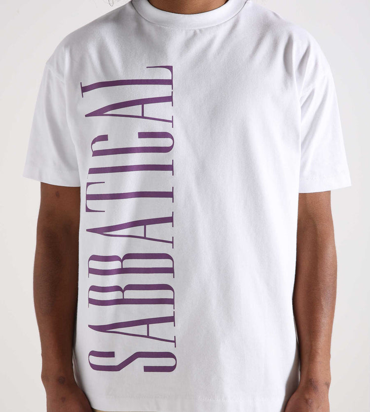 The Sabbatical Script Logo T-Shirt in White Navy combines understated design with everyday utility. Featuring a clean white base and a bold navy script logo, this piece offers a minimalist aesthetic that transitions seamlessly across settings. Its lightweight build ensures breathability, making it an effortless choice for layering or wearing solo.