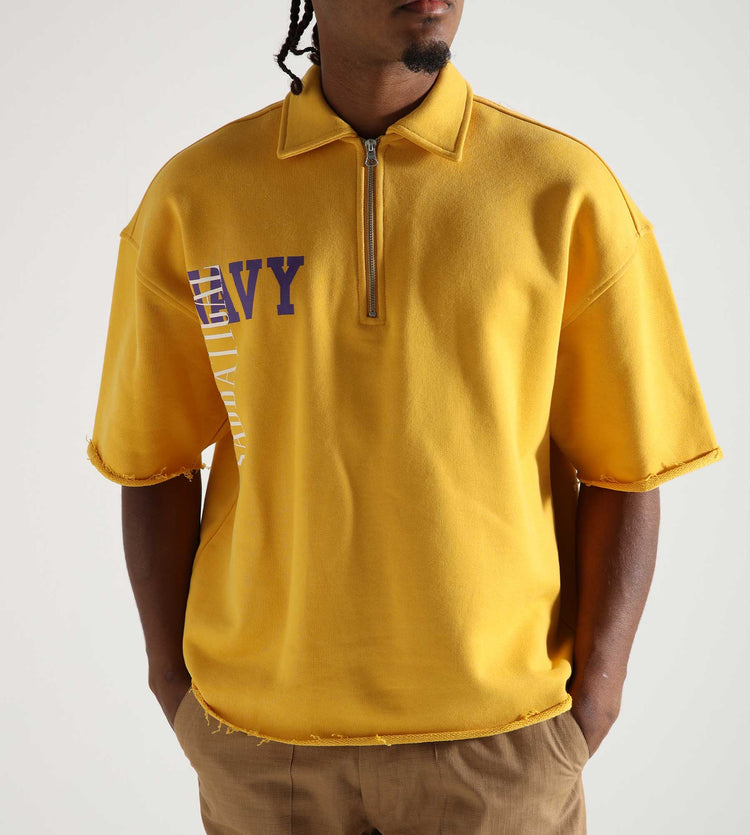 The Sabbatical Navy Half Zip Polo in Golden Rod is made from 100% high-quality organic cotton. It features the Sabbatical flip logo and a purple navy logo, both using screen print. The sleeves and bottom hem are cut off, inspired by old Champion sport garments used in the navy.