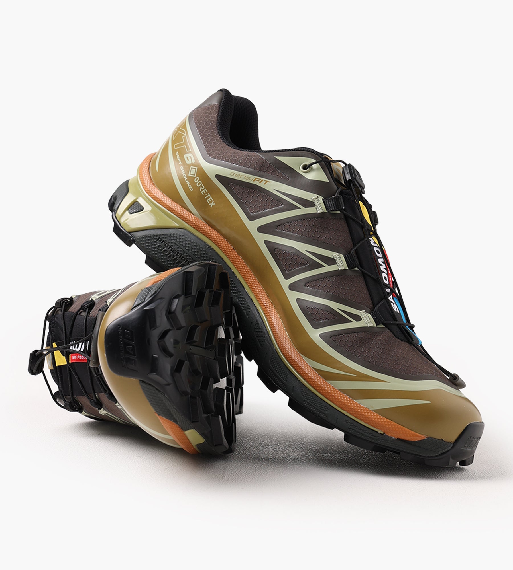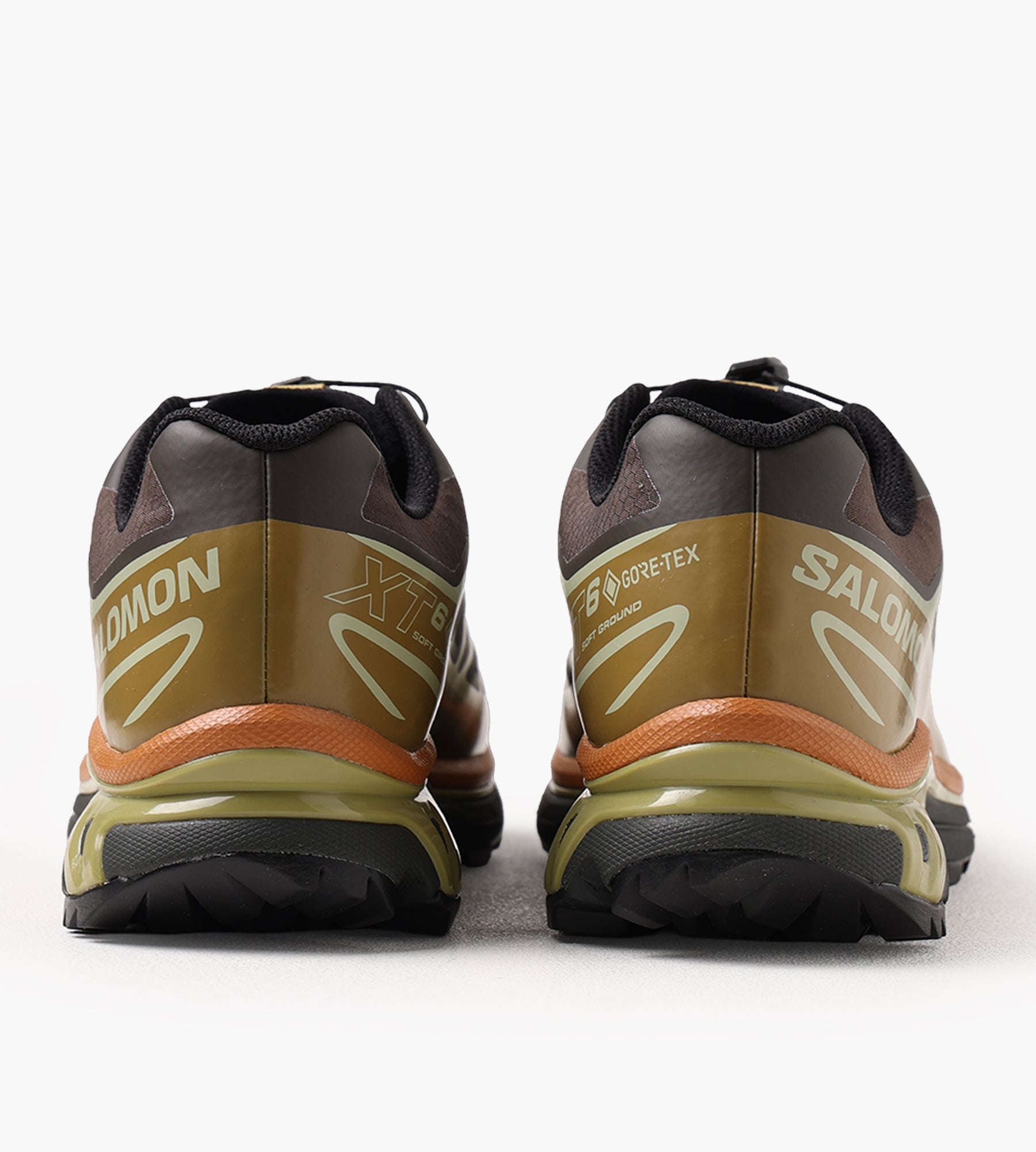 The Salomon XT-6 GTX in Delicioso Tea/Brilli combines advanced materials with a bold design, anchored by a GORE-TEX membrane that ensures complete waterproof protection. Its lightweight yet durable construction is engineered for trail and city use, balancing technical performance with everyday wearability.