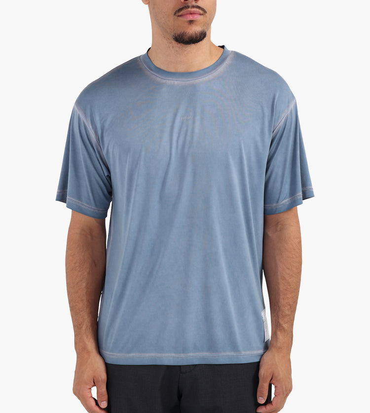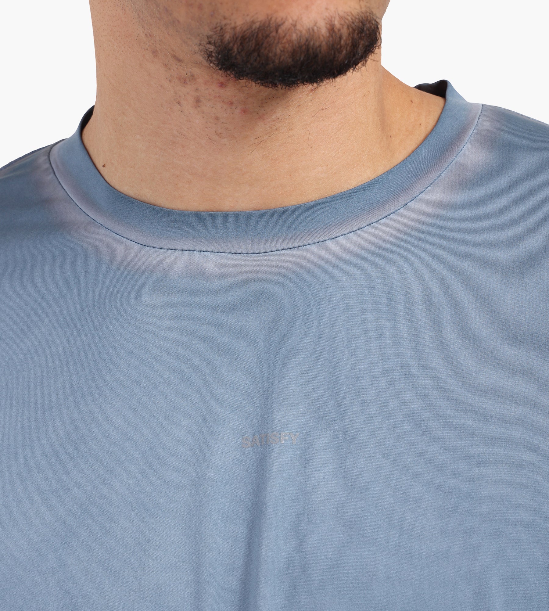 The Satisfy Auralite T-Shirt in Pigment Slate is crafted from the brand's proprietary Auralite fabric, offering a lightweight and breathable layer in a muted gray tone. Designed with a minimalist aesthetic, its clean lines and short-sleeve silhouette ensure effortless versatility for active or casual settings.