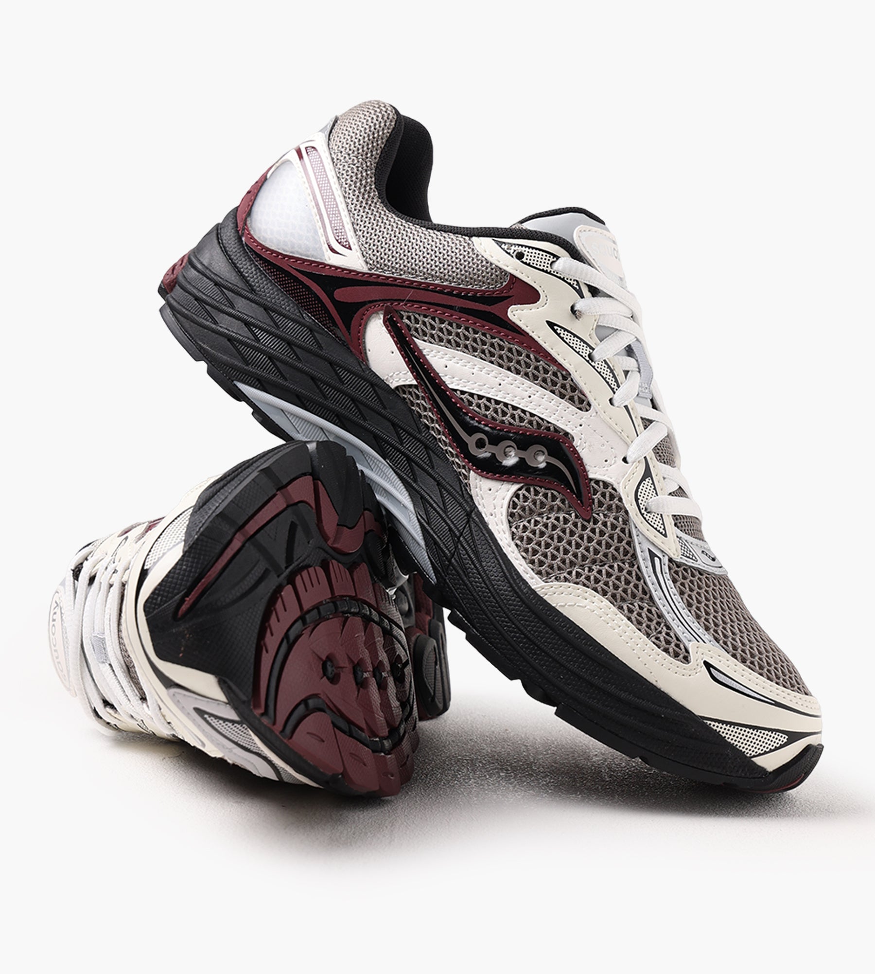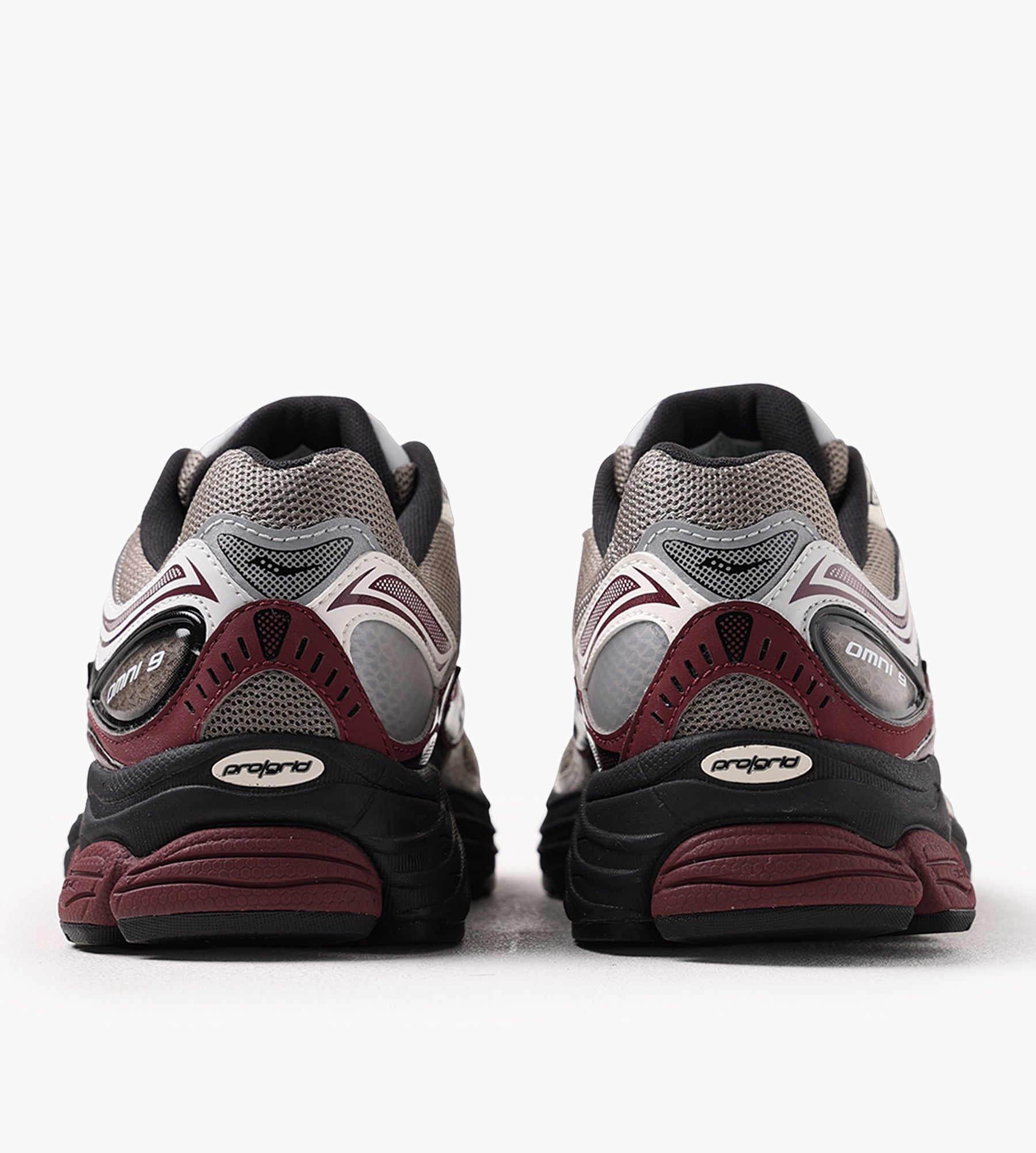 The Saucony ProGrid Omni 9 TMY in Tan/Maroon pairs retro aesthetics with modern performance, crafted with a breathable mesh upper and synthetic overlays for durability. The tan base is accented by maroon detailing, creating a versatile colorway that transitions seamlessly across settings.