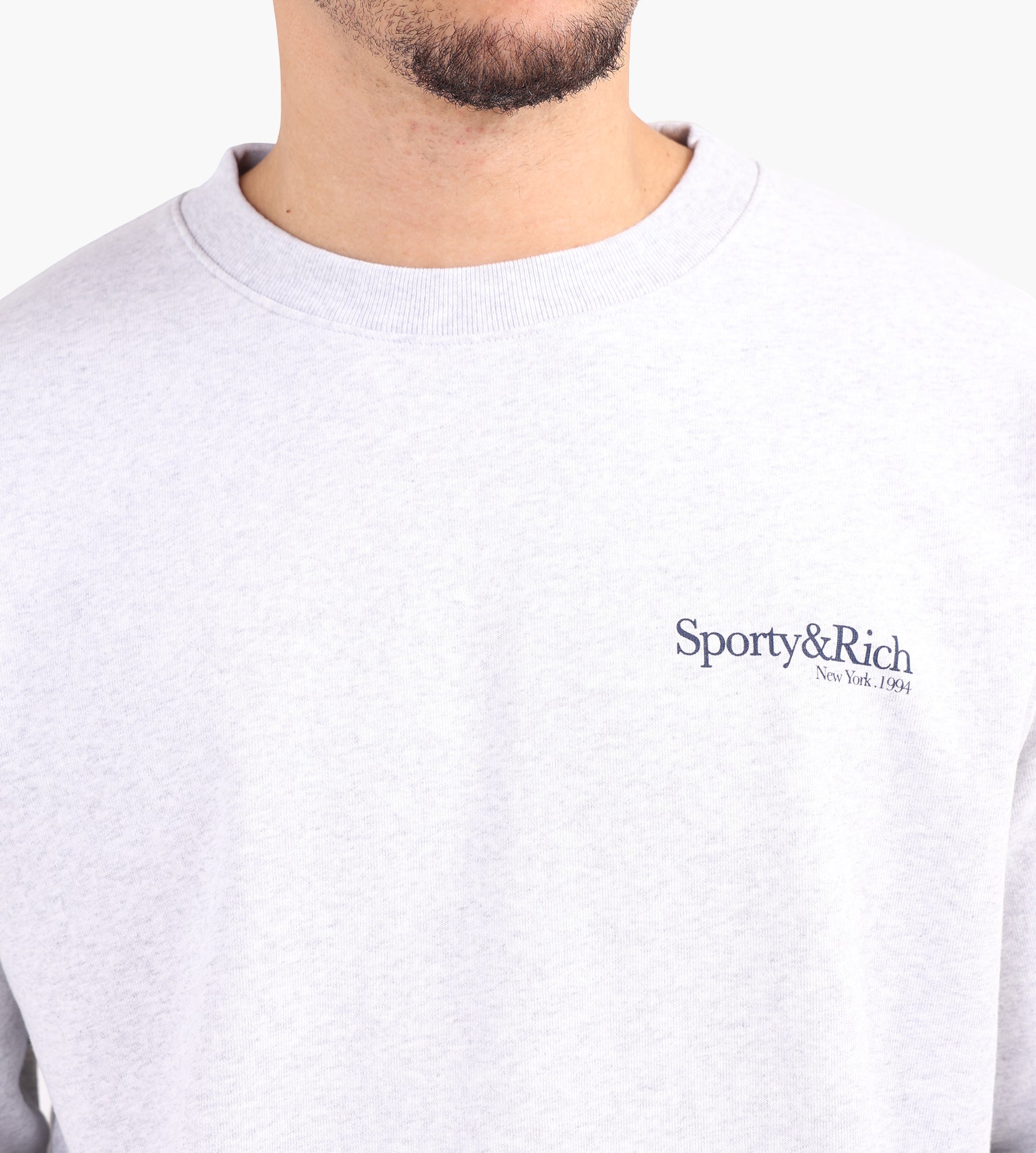 The Sporty & Rich 94 Running Club Crewneck in Heather Gray is crafted from a premium blend of 98% cotton and 2% polyester, offering a soft yet durable layer. Made from USA-grown cotton and garment dyed for a rich, lived-in finish, it features brushed fleece for added comfort and warmth. A slightly oversized fit and ribbed trims at the neckline, cuffs, and hem lend a relaxed yet refined silhouette.