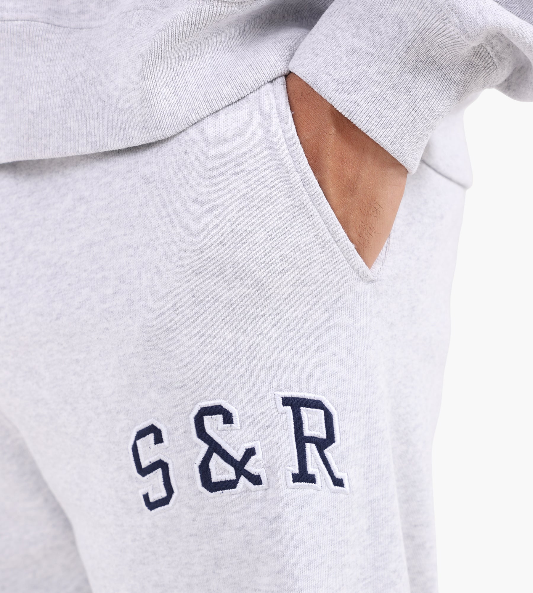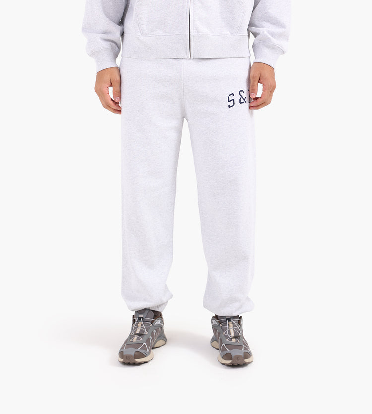 The S&R Ivy Sweatpant by Sporty & Rich in Heather Gray/Navy combines timeless collegiate aesthetics with premium craftsmanship. Made from 100% cotton in a substantial 11.5 oz weight, these sweatpants are garment dyed for a rich, lived-in texture that improves with wear. Navy 'S & R' lettering contrasts against the light gray backdrop, offering a refined nod to classic athletic wear.