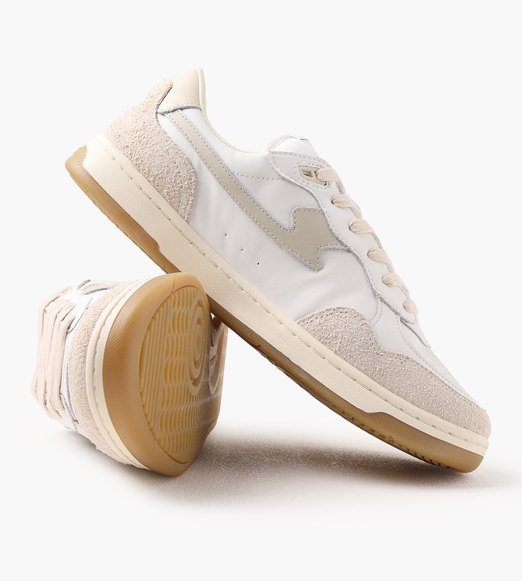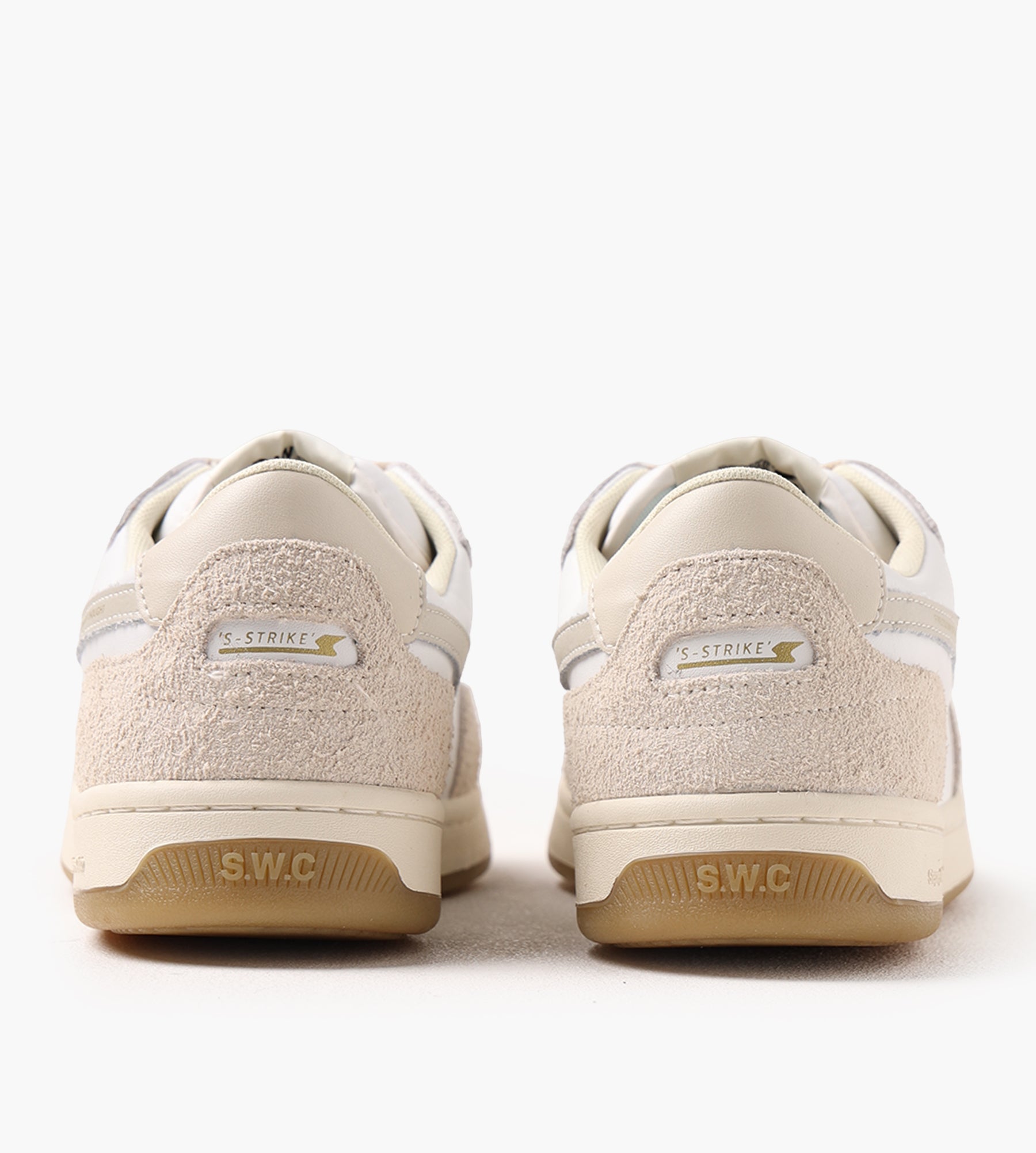 The Stepney Workers Club Pro Cup 01 S-Strike Leather Sneaker in Spring White reimagines classic court footwear with a refined mix of materials and precision detailing. A white leather and ecru suede paneled upper is paired with a putty leather S-Strike identifier, delivering a subtle yet distinctive contrast. The lightweight cupsole construction and sidewall stitching ensure durability while maintaining a streamlined silhouette.