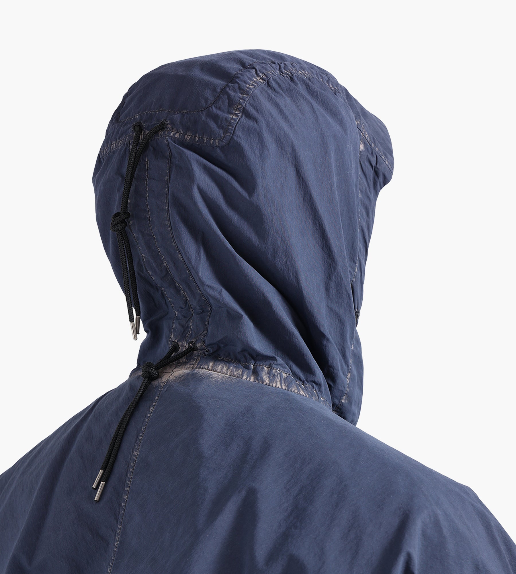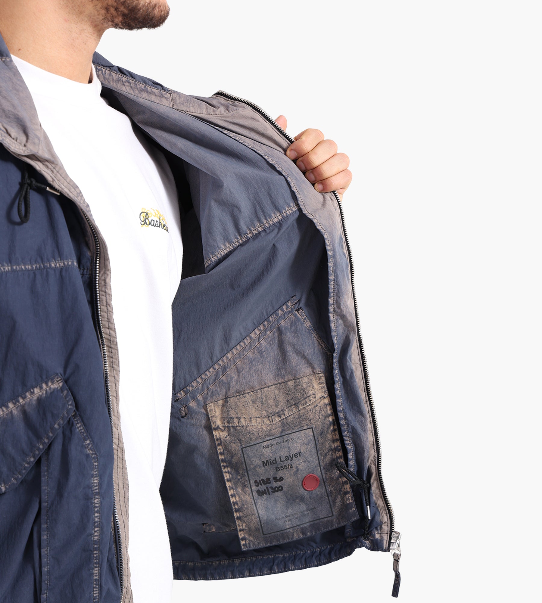 Ten-C Mid Layer Jacket in Ice Blue. Crafted in Italy from lightweight nylon with a clean, technical finish. Features a concealed snap-button closure, pointed collar, chest pocket, and adjustable drawcord hem. Designed to be worn as a standalone jacket or layered under outerwear.