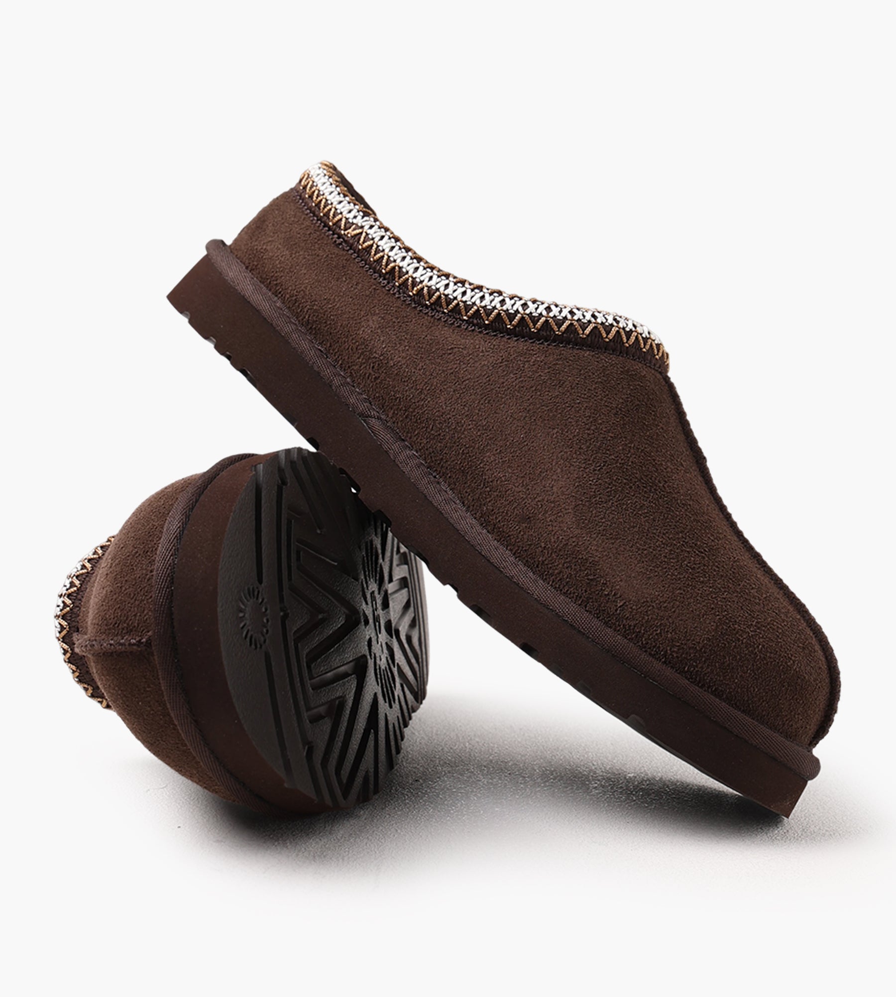 The UGG Men's Tasman II Slippers in Dusted Cocoa blend heritage craftsmanship with contemporary sustainability. Featuring a premium suede upper, the design is accented by the signature UGGbraid collar, crafted from 100% recycled polyester fibers. A 17mm sheepskin lining and insole deliver unparalleled softness, while the foam footbed provides all-day cushioning.