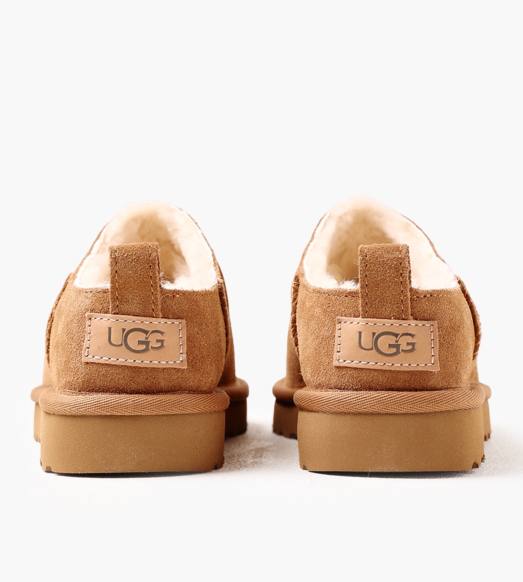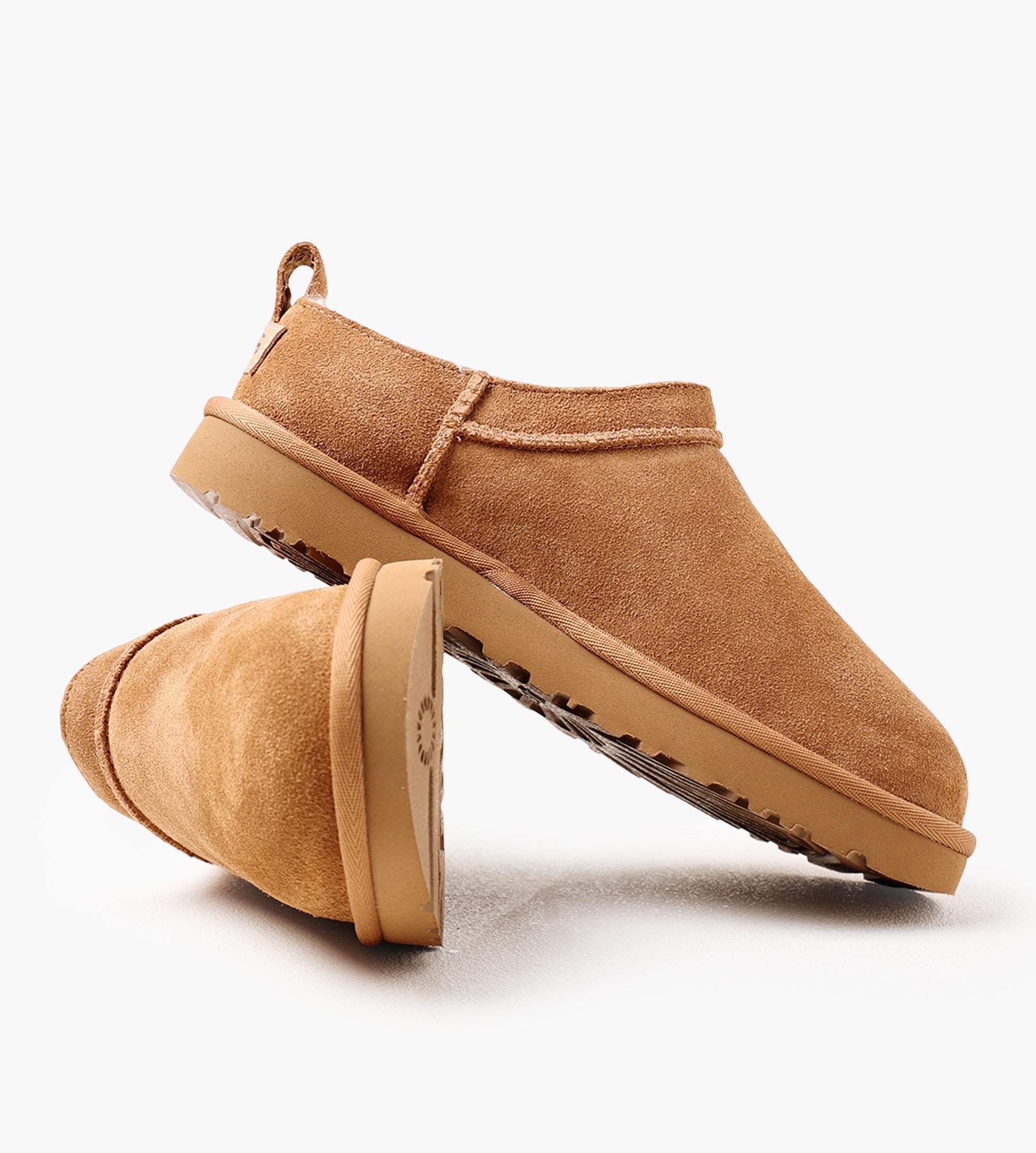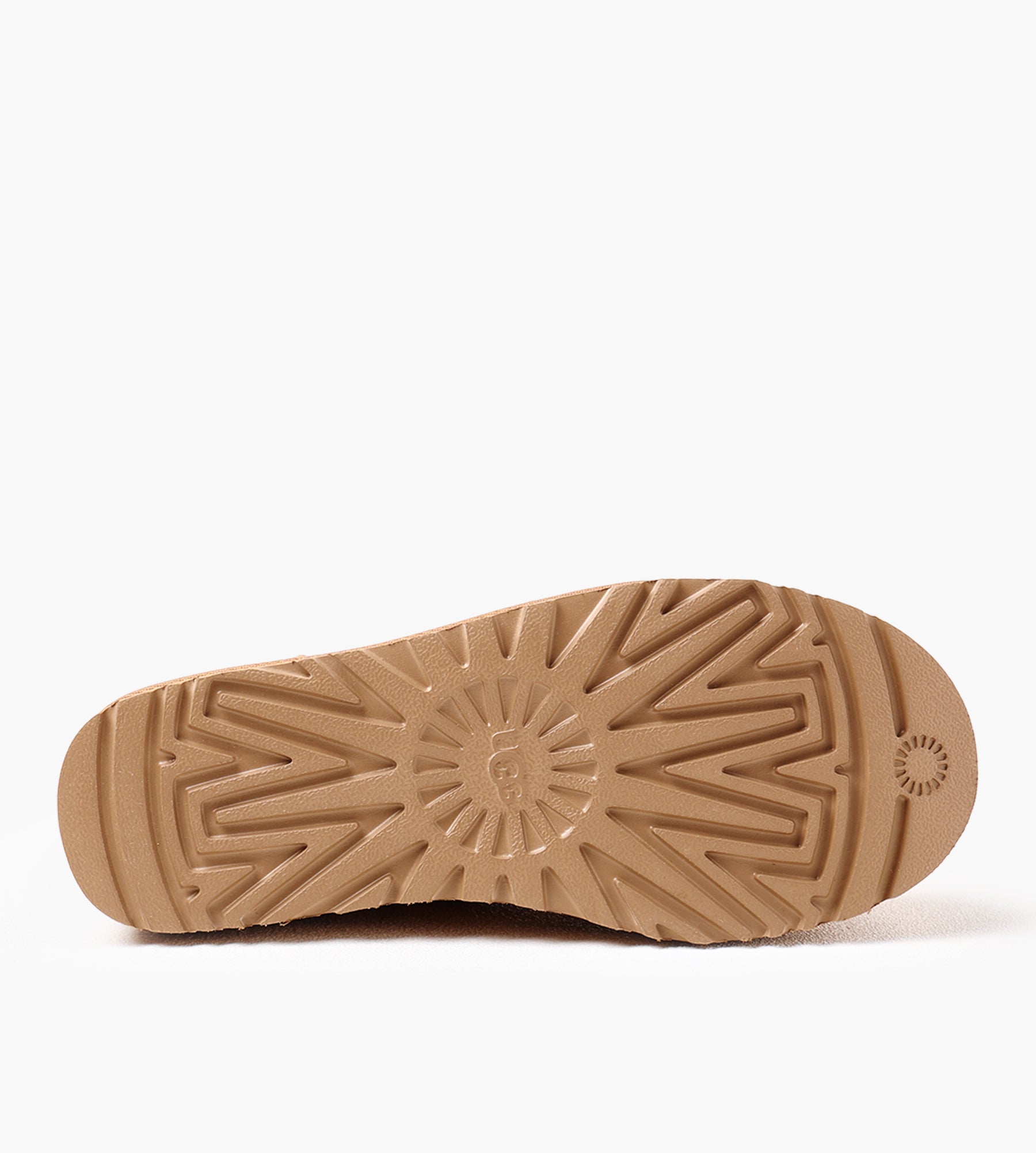 The UGG Classic Micro in Chestnut combines genuine suede with a plush sheepskin lining for a luxurious feel. Treated with a water-repellent finish, the suede upper resists light moisture, while the 10mm shaft and 17mm vamp sheepskin linings provide natural temperature regulation, ensuring comfort whether worn with or without socks.