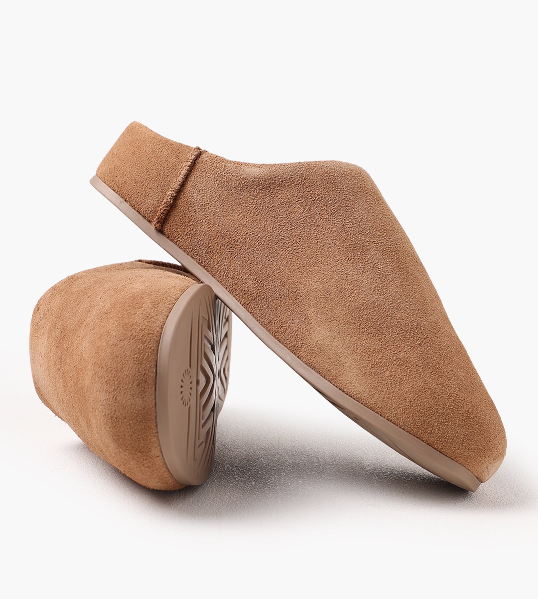 The UGG Elea Slip-On in Chestnut combines water-resistant suede with a minimalist round-toe silhouette, creating a versatile staple for casual wear. The padded foam upper enhances comfort, while the post-applied treatment ensures durability against light exposure to the elements.