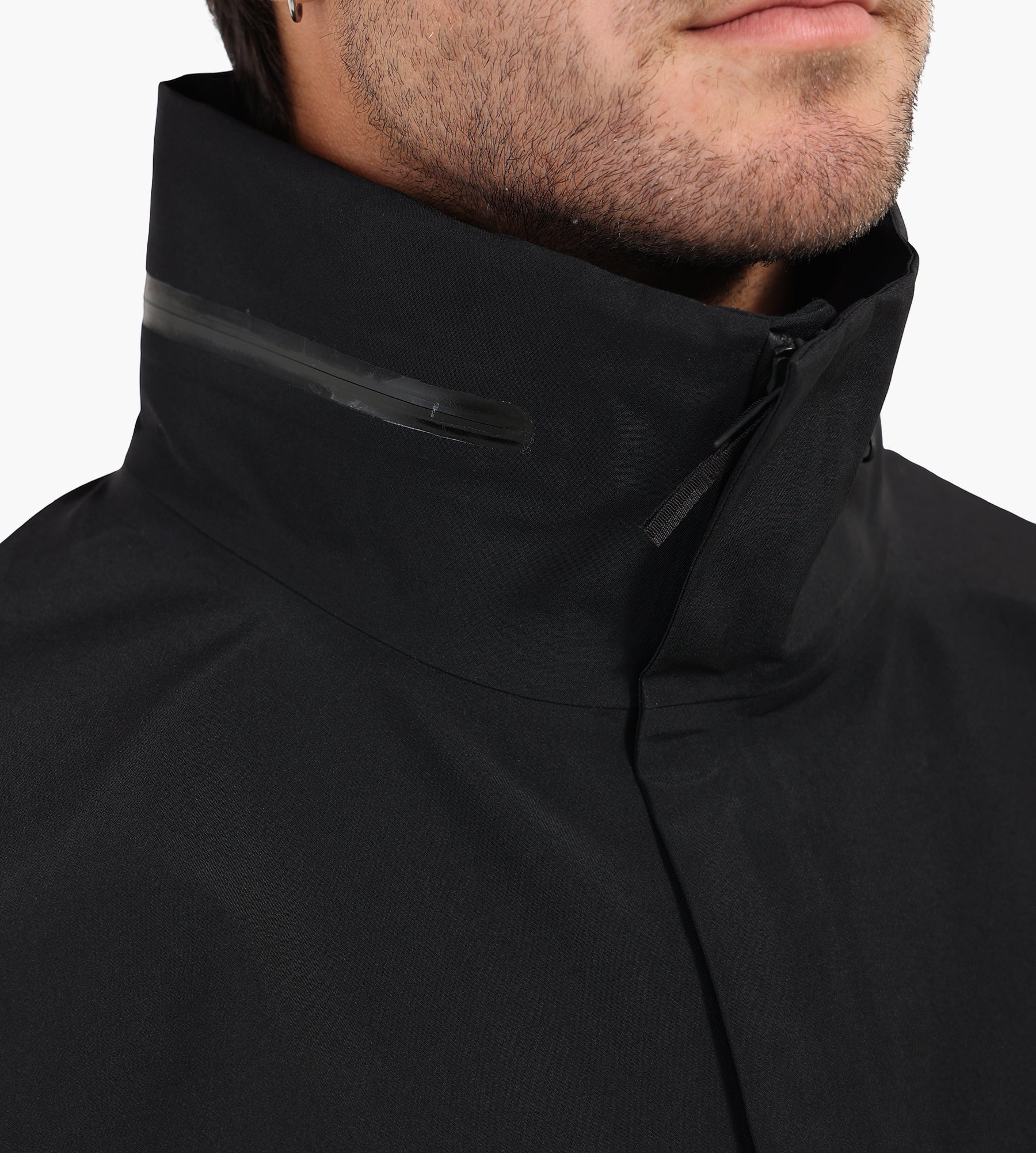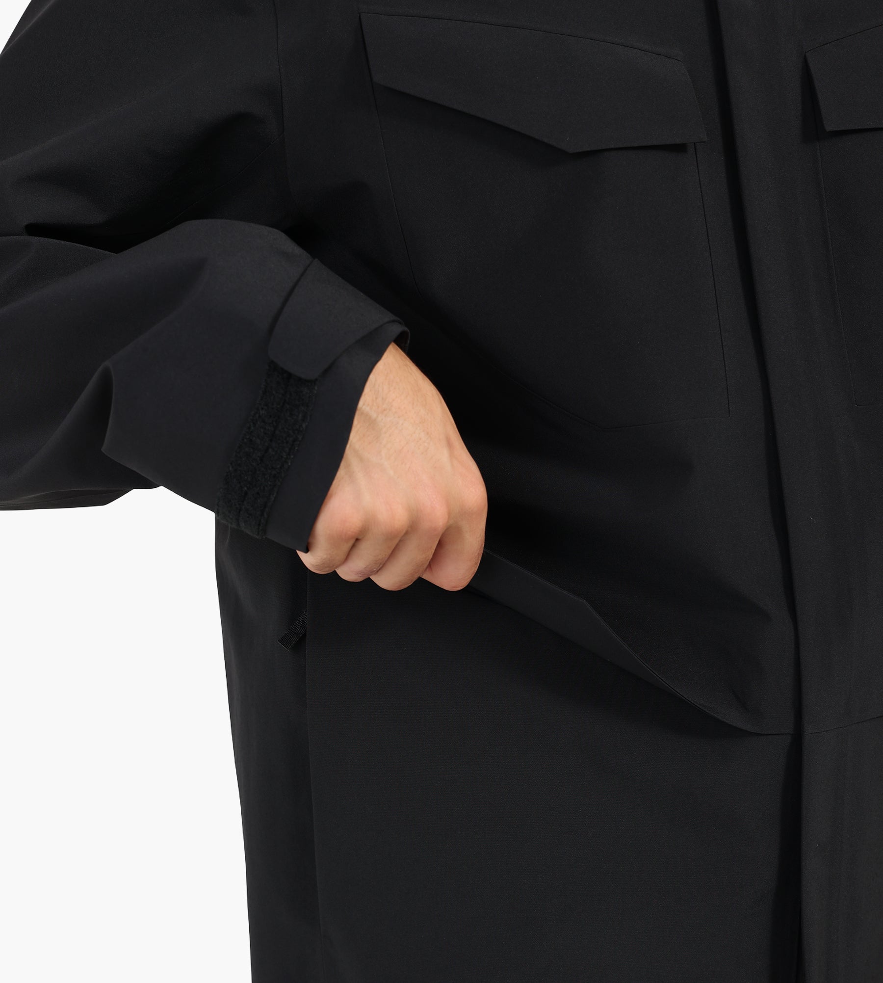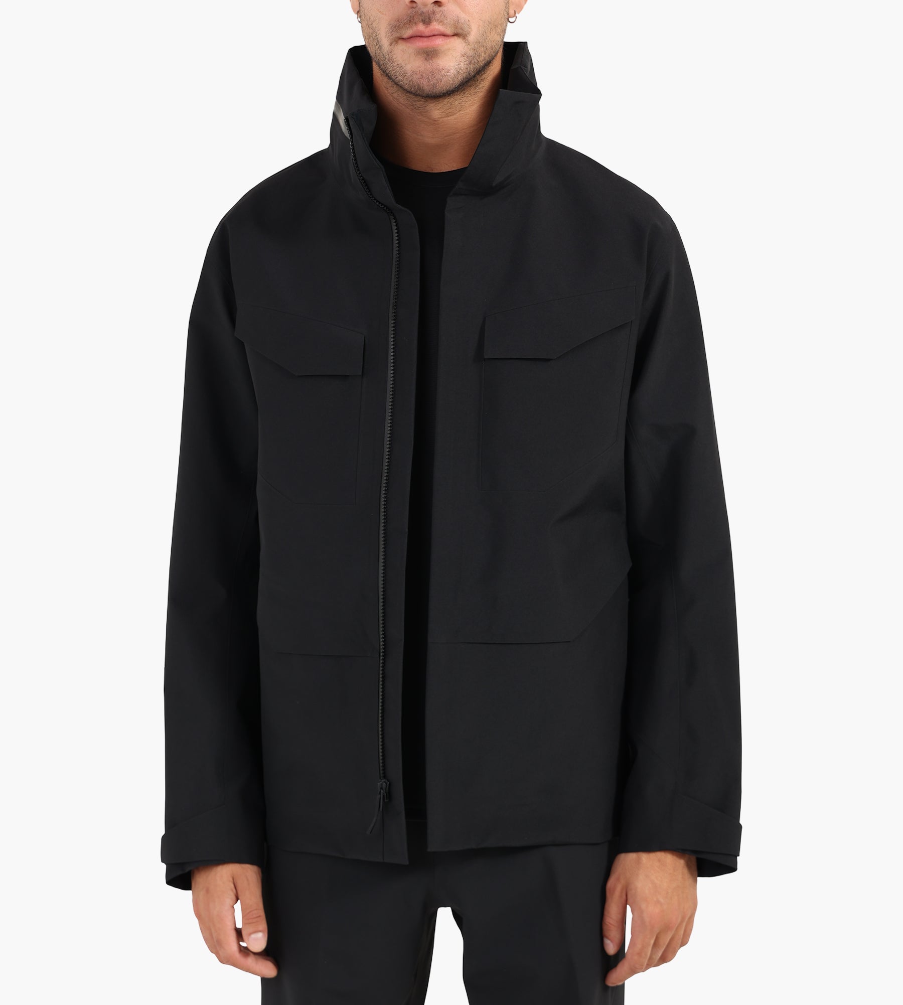 The Veilance Field Jacket in black is constructed from 3-layer GORE-TEX PRO ePE, delivering a fully waterproof yet highly breathable barrier against the elements. Its smooth, matte finish and precision-sealed seams underscore a commitment to technical performance, free from intentionally added PFAS for a cleaner environmental footprint.