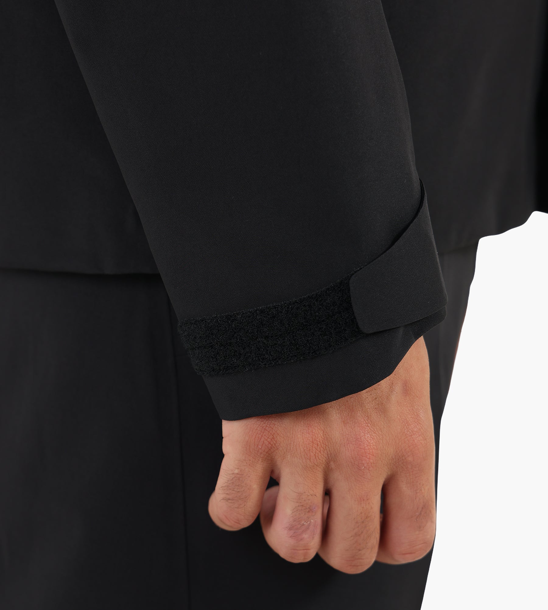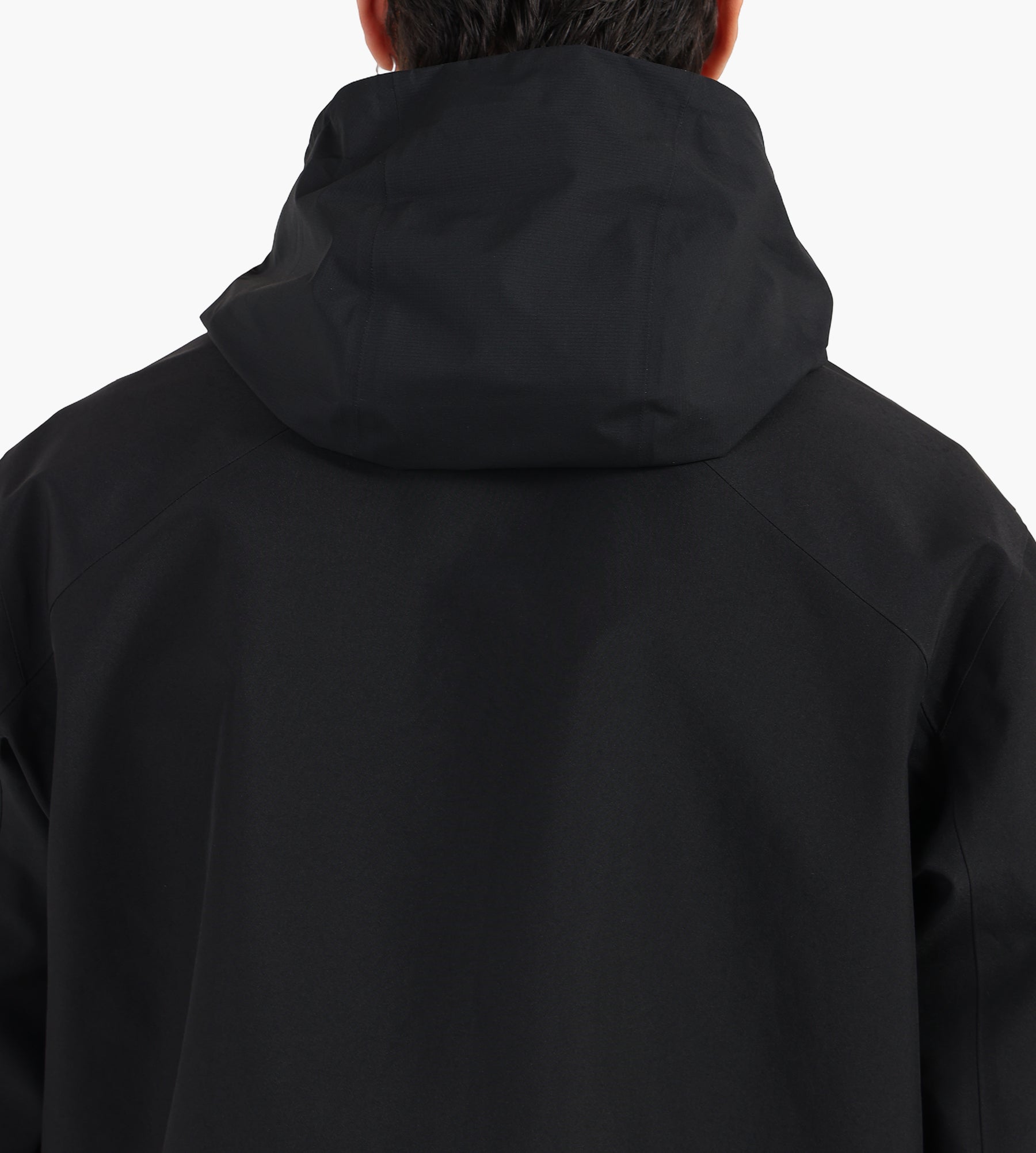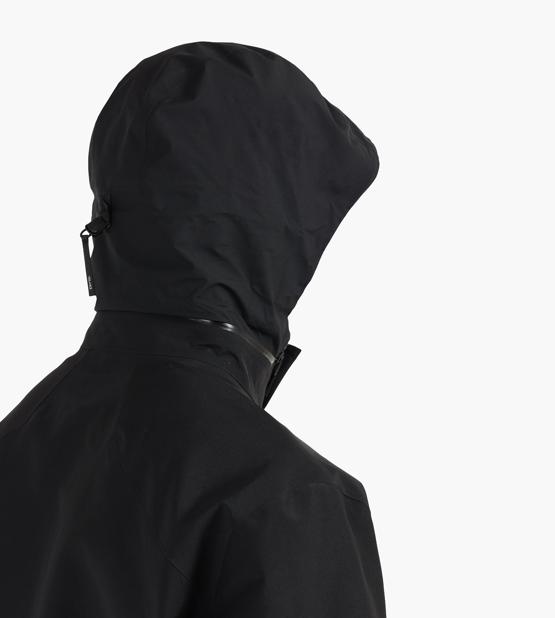 The Veilance Field Jacket in black is constructed from 3-layer GORE-TEX PRO ePE, delivering a fully waterproof yet highly breathable barrier against the elements. Its smooth, matte finish and precision-sealed seams underscore a commitment to technical performance, free from intentionally added PFAS for a cleaner environmental footprint.