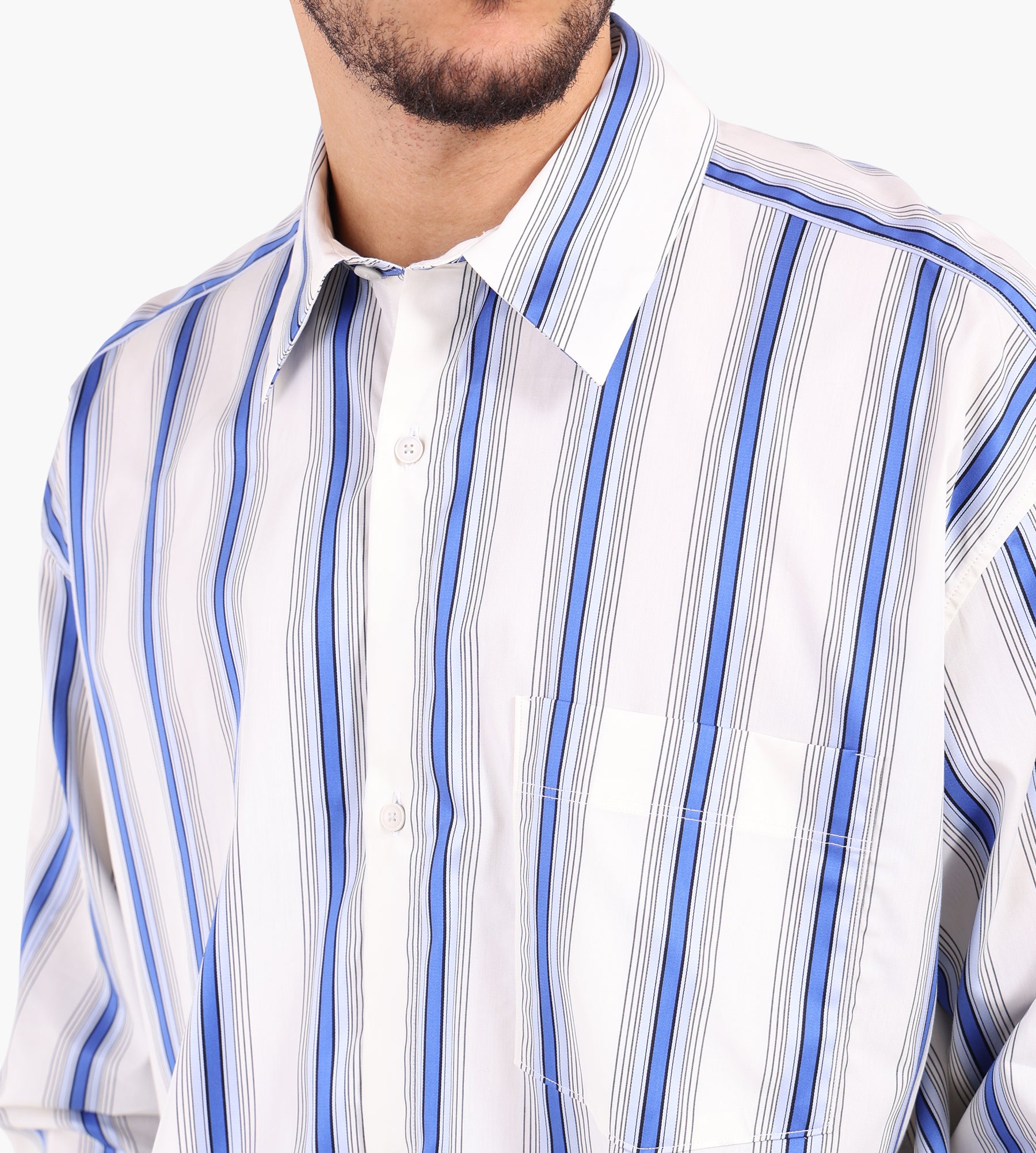 The Won Hundred Maza Panel Shirt in Deep Ultramarine COMB. is crafted from 100% cotton with a textured weave, lending a relaxed, vintage-inspired aesthetic. Its original stripe pattern is complemented by distinctive sleeve panel detailing, creating a refined yet understated visual contrast. A low-placed chest pocket and button front closure add functional touches to this loose-fit silhouette.